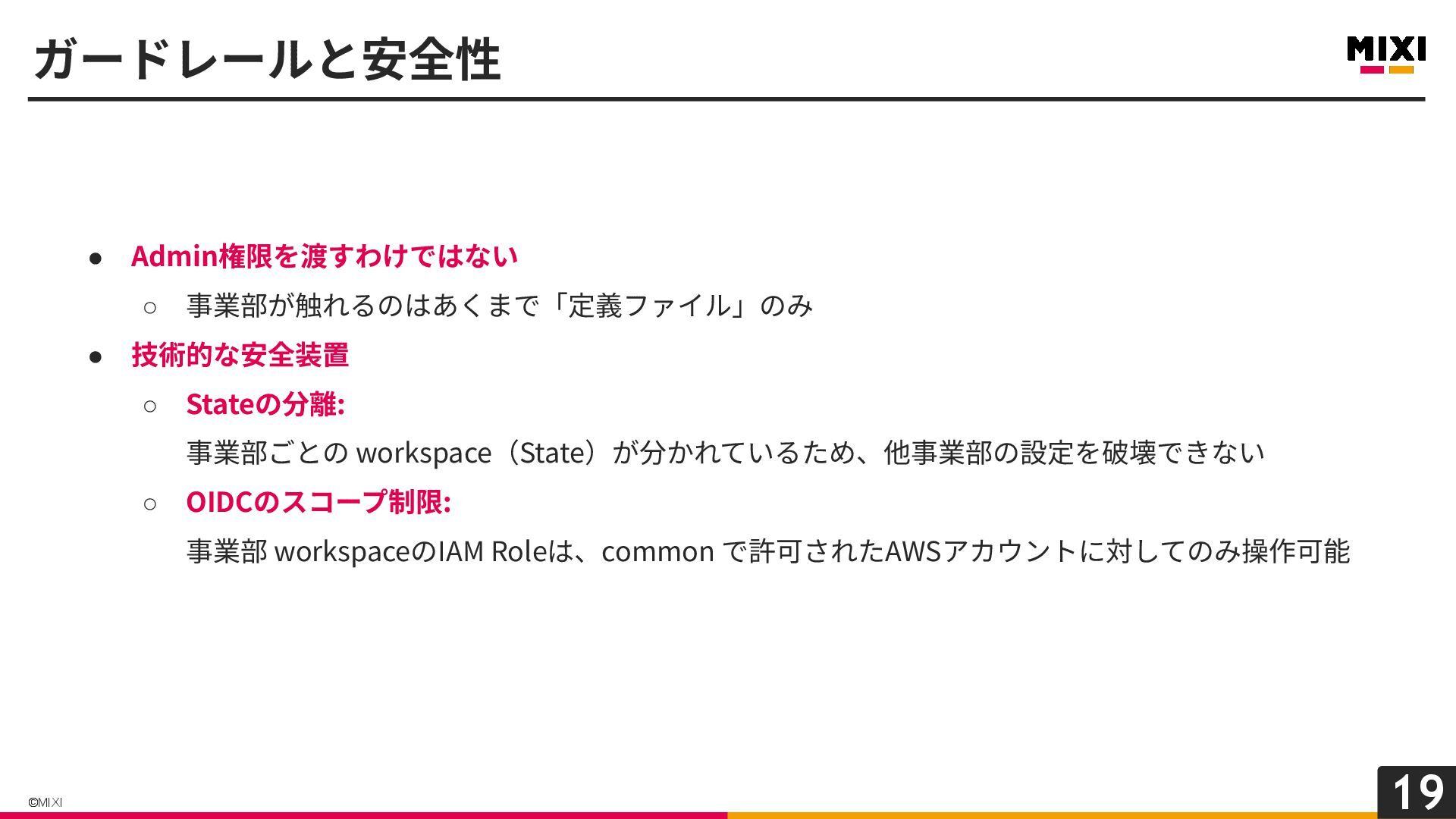 16. ©MIXI 19 • Admin権限を渡すわけではない ◦ 事業部が触れるのはあくまで「定義ファイル」のみ • 技術的な安全装置 ◦ Stateの分離: