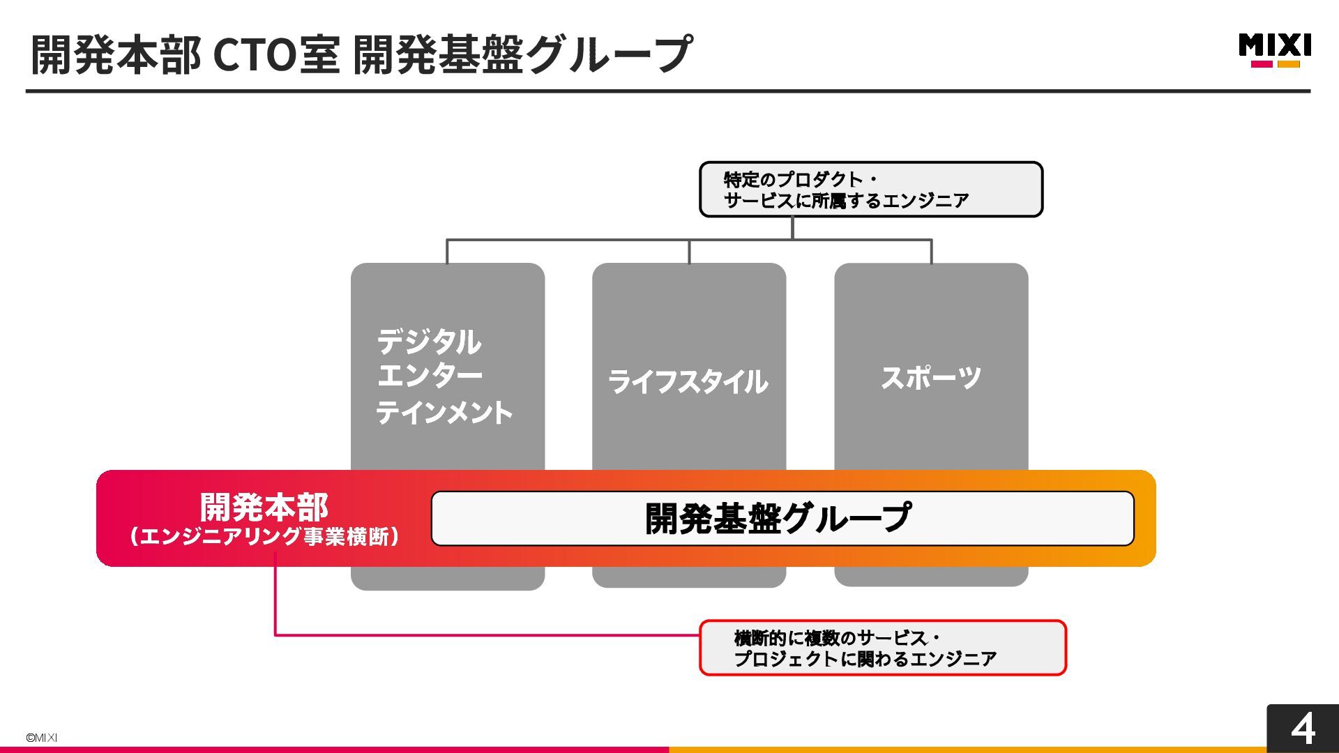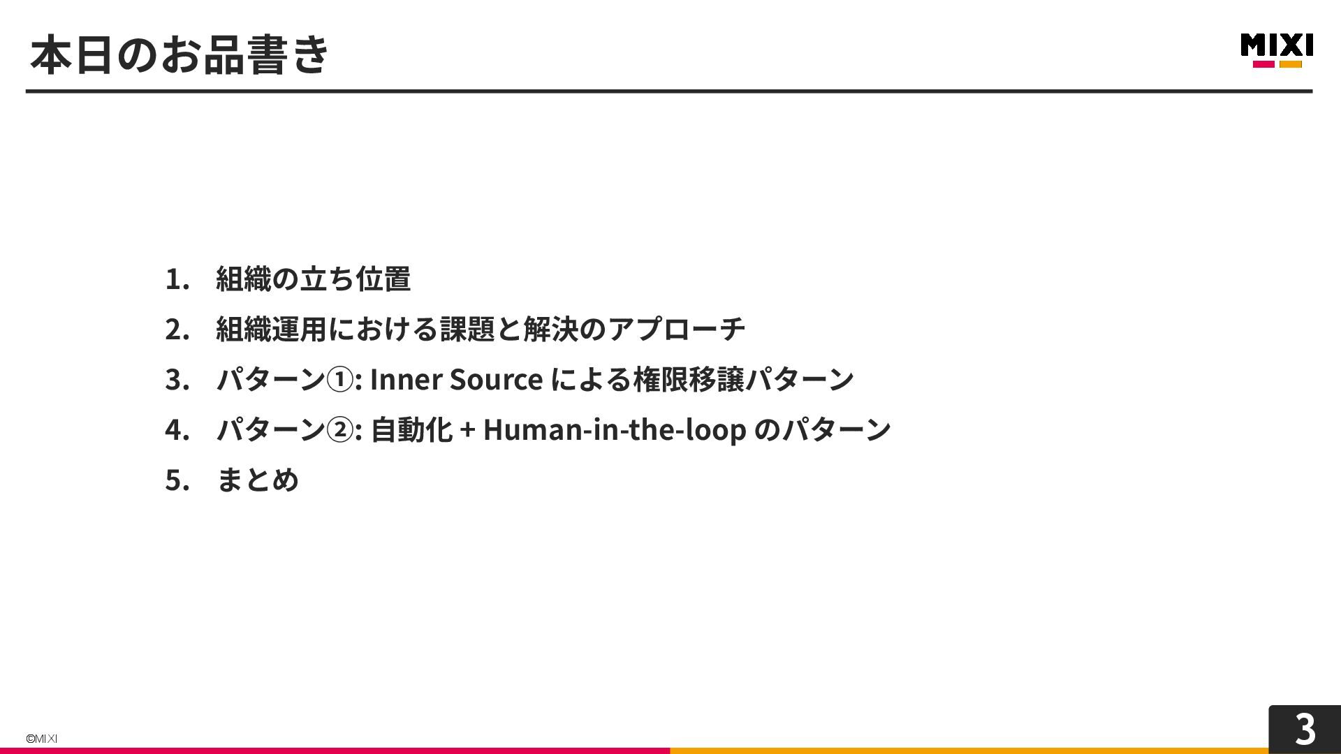 3. ©MIXI 3 1. 組織の⽴ち位置 2. 組織運⽤における課題と解決のアプローチ 3. パターン①: Inner Source