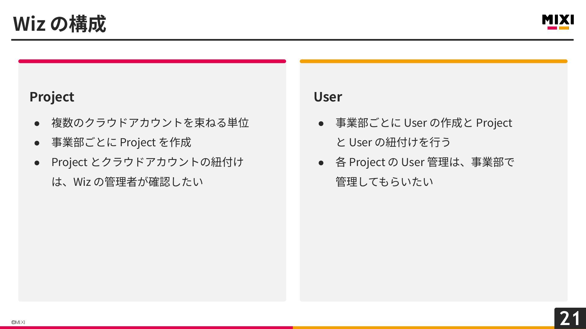 18. ©MIXI 21 Wiz の構成 Project • 複数のクラウドアカウントを束ねる単位 • 事業部ごとに Project