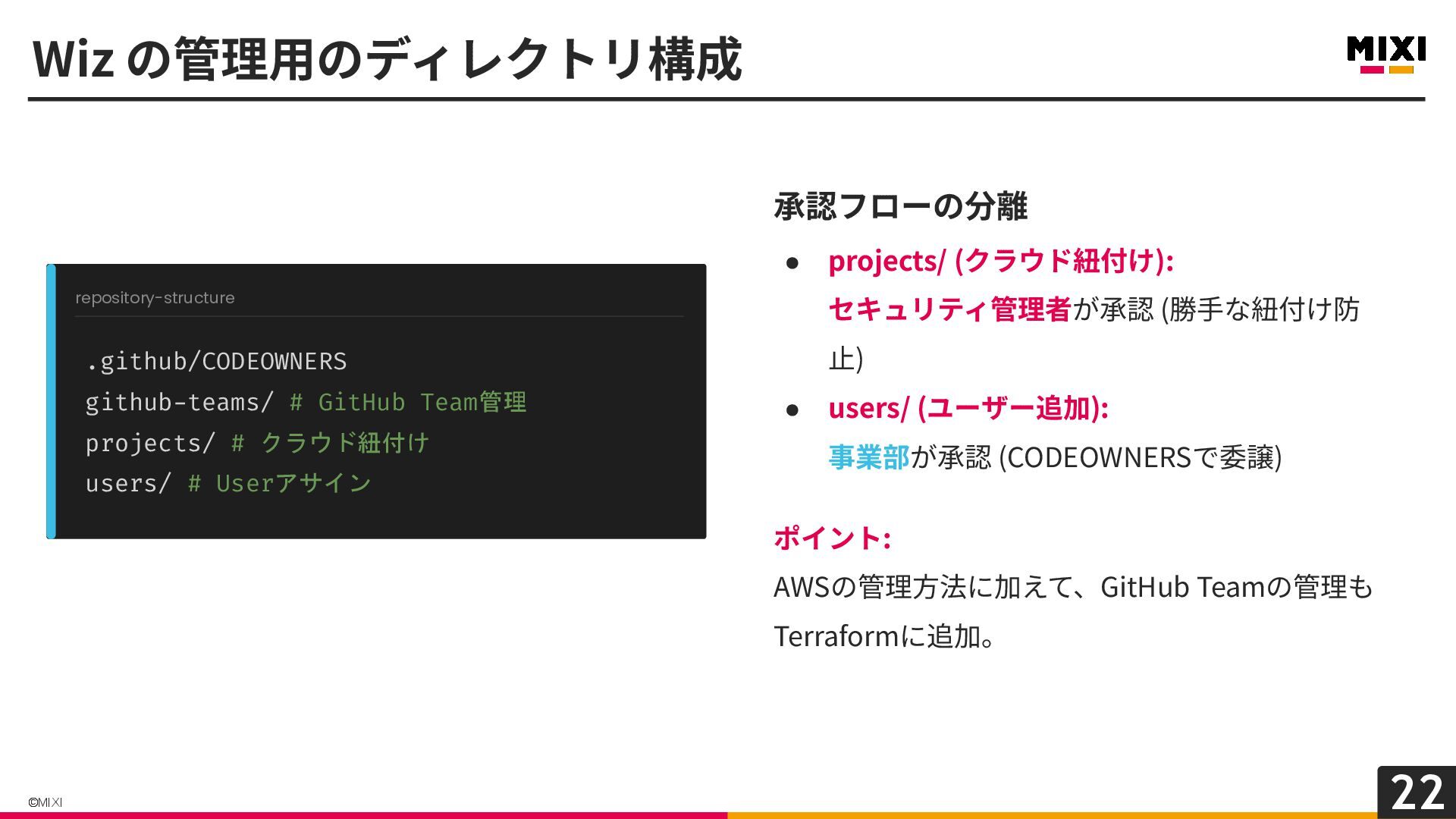 users/ (ユーザー追加): 事業部が承認 (CODEOWNERSで委譲) ポイント: AWSの管理⽅法に加えて、GitHub Teamの管理も Terraformに追加。 Wiz の管理⽤のディレクトリ構成 repository-structure .github/CODEOWNERS github-teams/ # GitHub Team管理 projects/ # クラウド紐付け users/ # Userアサイン