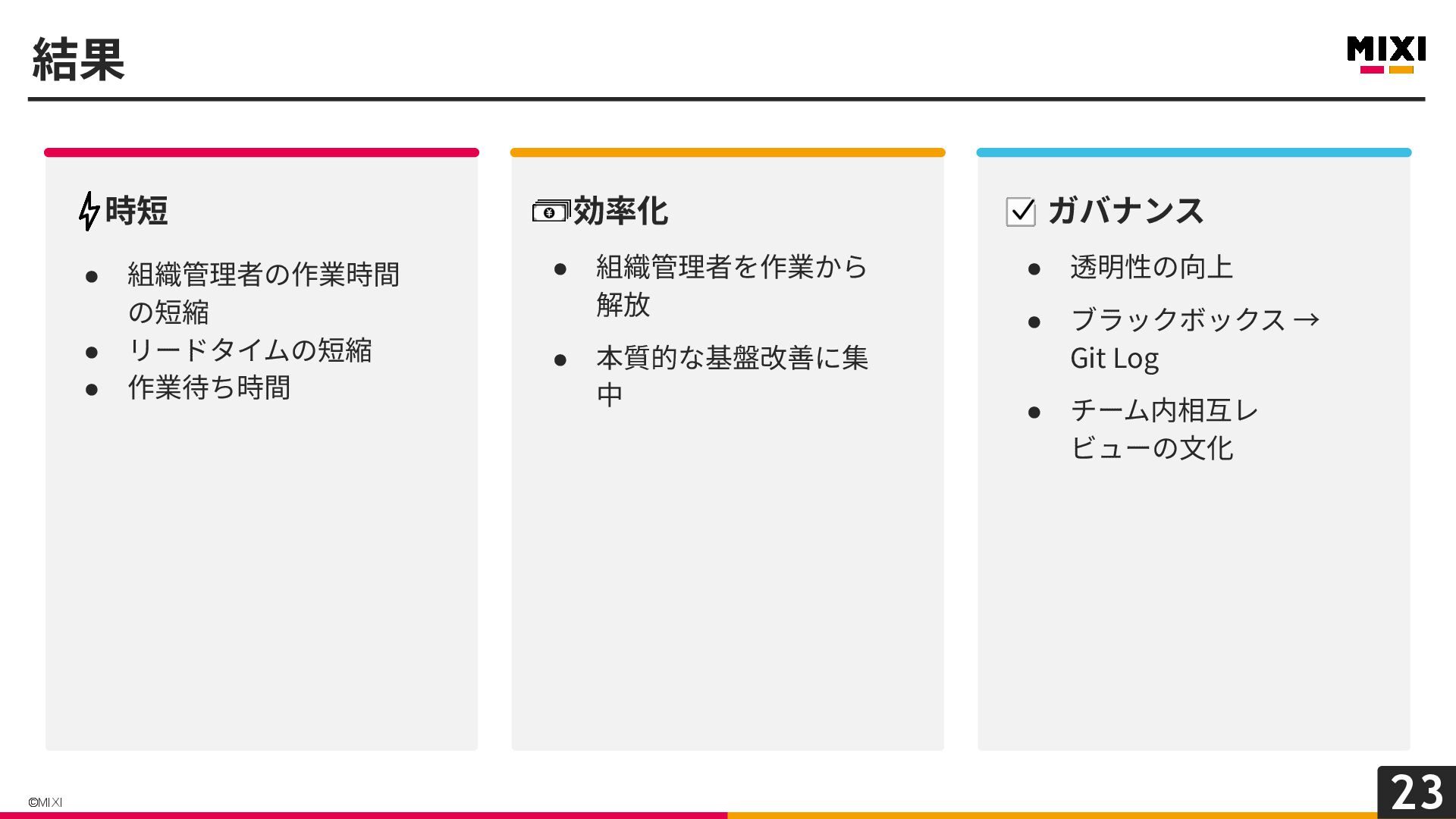 20. ©MIXI 23 結果  時短 • 組織管理者の作業時間 の短縮 • リードタイムの短縮 •
