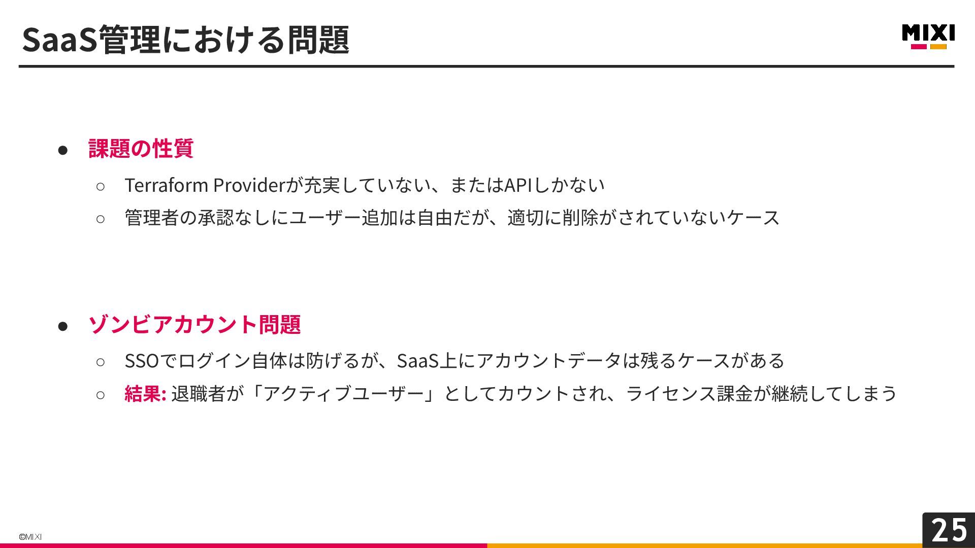 21. ©MIXI 25 • 課題の性質 ◦ Terraform Providerが充実していない、またはAPIしかない ◦ 管理者の承認なしにユーザー追加は⾃由だが、適切に削除がされていないケース •
