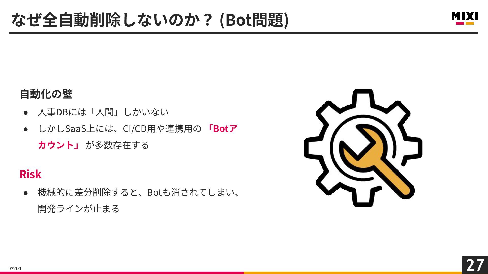 23. ©MIXI 27 ⾃動化の壁 • ⼈事DBには「⼈間」しかいない • しかしSaaS上には、CI/CD⽤や連携⽤の 「Botア カウント」 が多数存在する