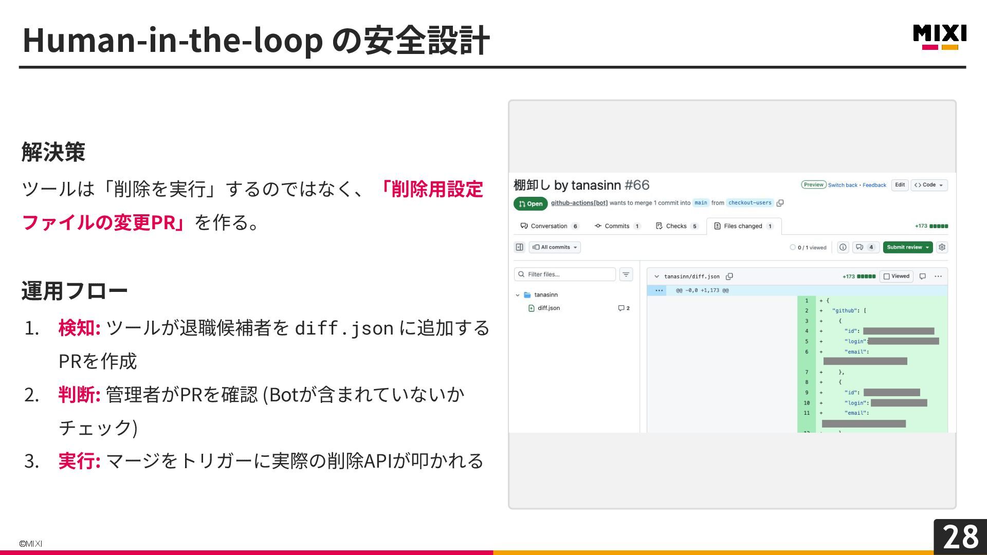 24. ©MIXI 28 解決策 ツールは「削除を実⾏」するのではなく、「削除⽤設定 ファイルの変更PR」を作る。 運⽤フロー 1. 検知: ツールが退職候補者を diff.json