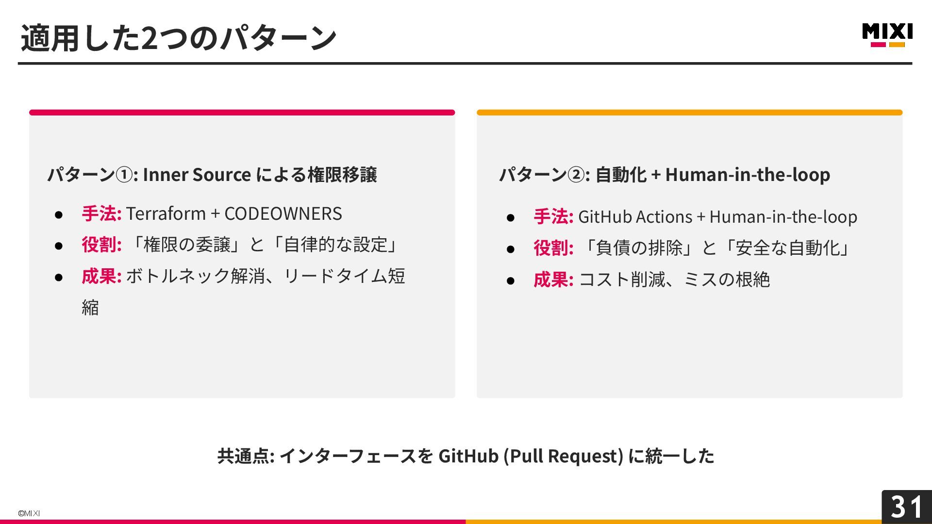 25. ©MIXI 31 適⽤した2つのパターン パターン①: Inner Source による権限移譲 • ⼿法: Terraform