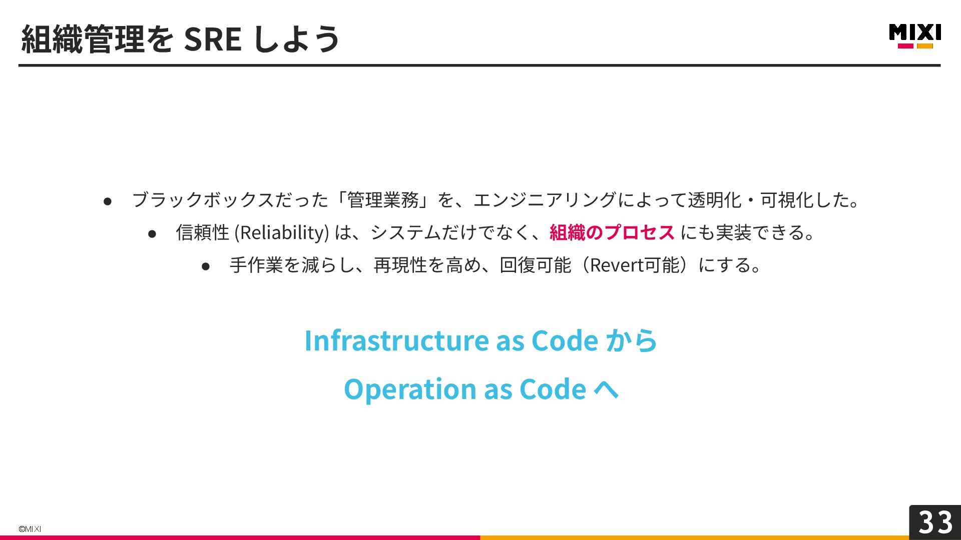 ⼿作業を減らし、再現性を⾼め、回復可能(Revert可能)にする。 Infrastructure as Code から Operation as Code へ 組織管理を SRE しよう