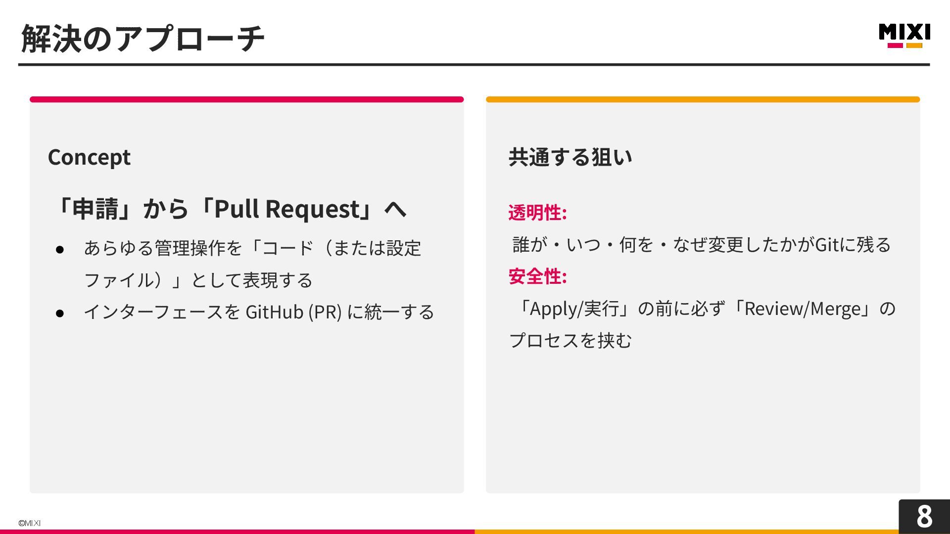 6. ©MIXI 8 解決のアプローチ Concept 「申請」から「Pull Request」へ • あらゆる管理操作を「コード(または設定 ファイル)」として表現する •