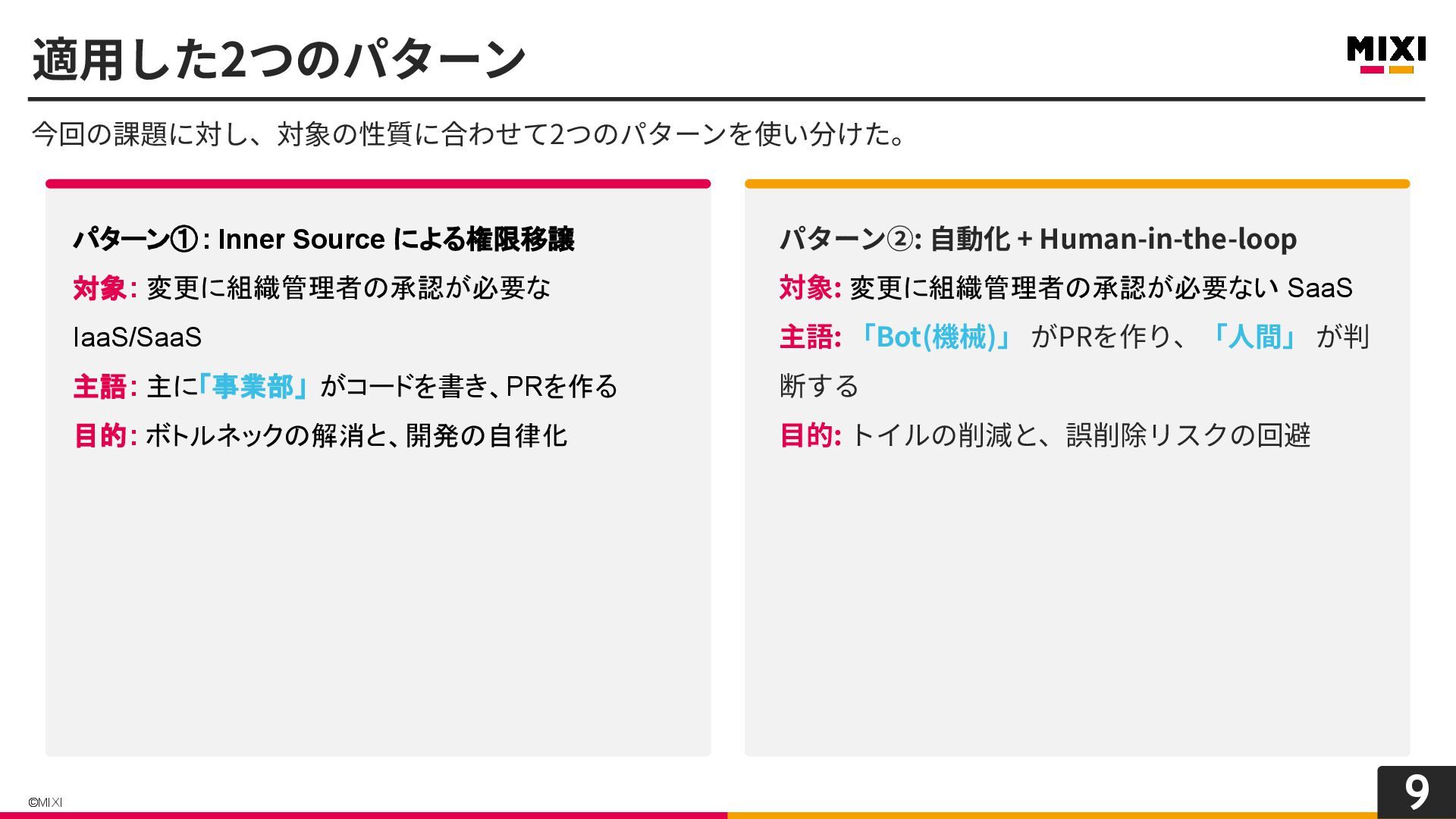 7. ©MIXI 9 今回の課題に対し、対象の性質に合わせて2つのパターンを使い分けた。 適⽤した2つのパターン パターン① : Inner Source による権限移譲 対象: