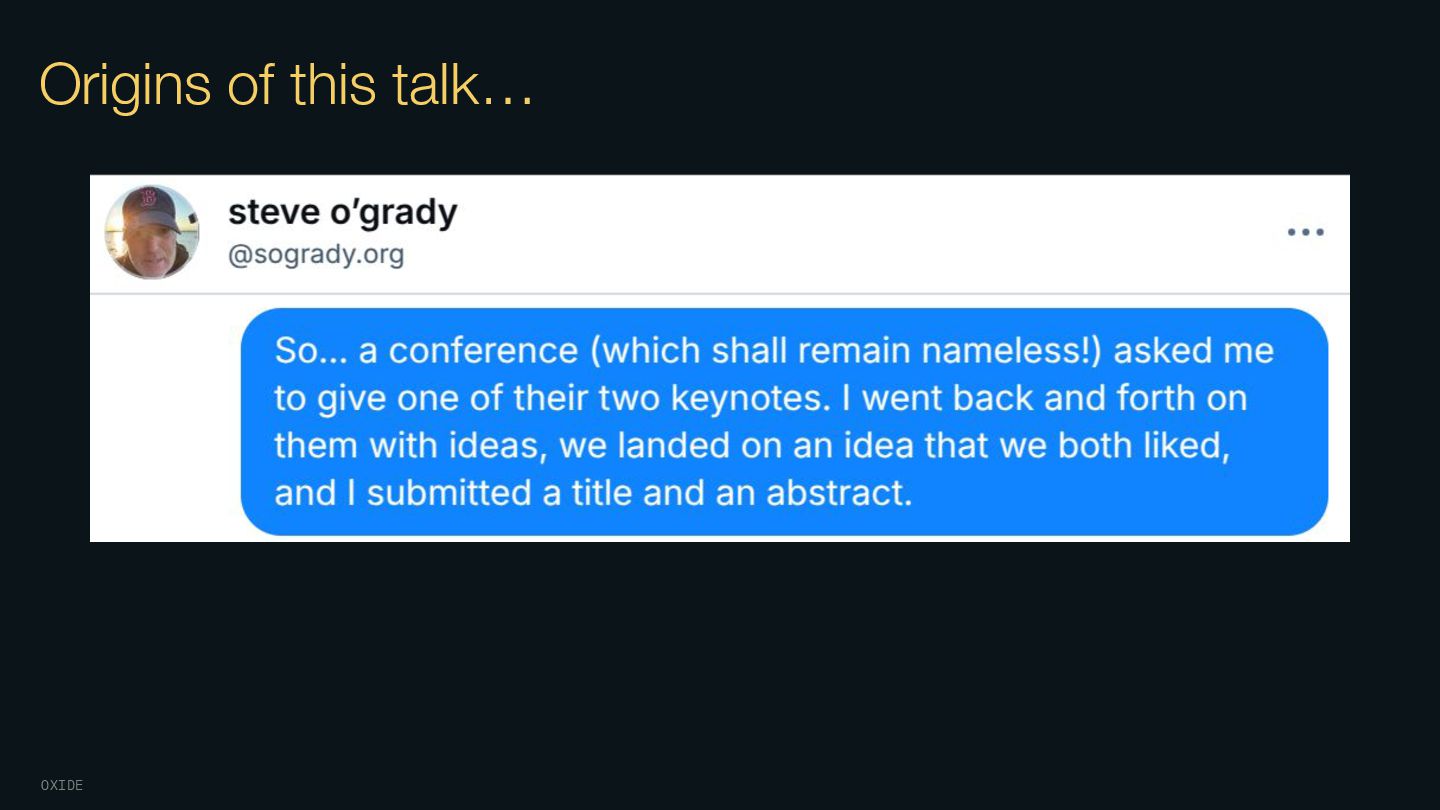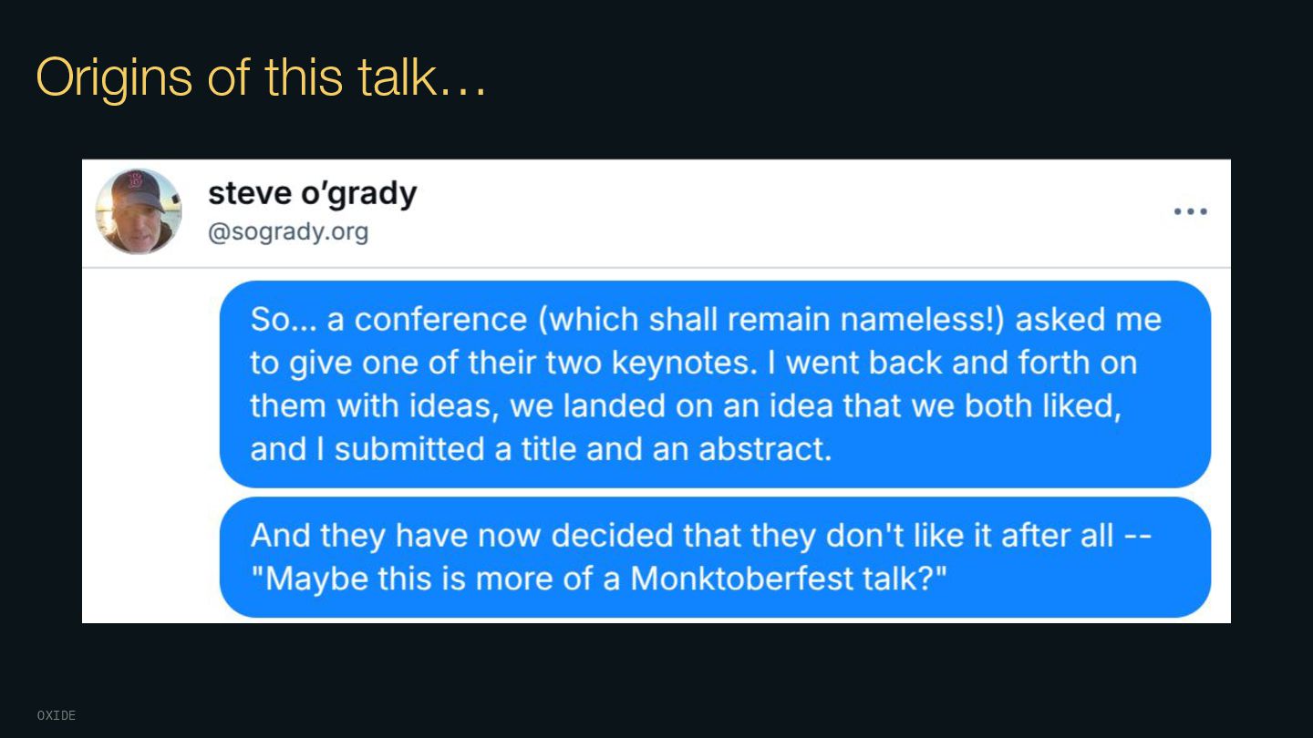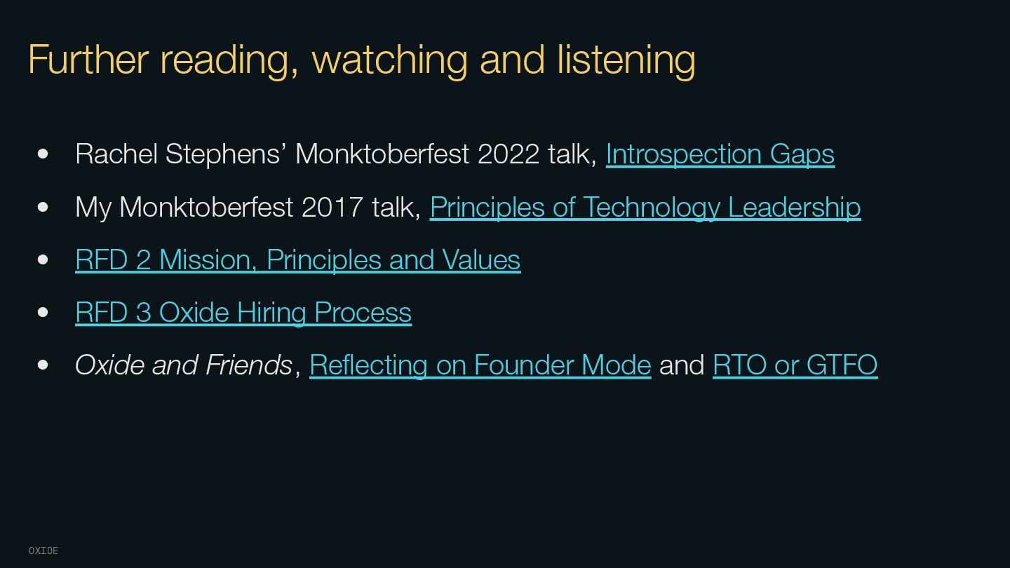 2022 talk, Introspection Gaps • My Monktoberfest 2017 talk, Principles of Technology Leadership • RFD 2 Mission, Principles and Values • RFD 3 Oxide Hiring Process • Oxide and Friends, Reflecting on Founder Mode and RTO or GTFO