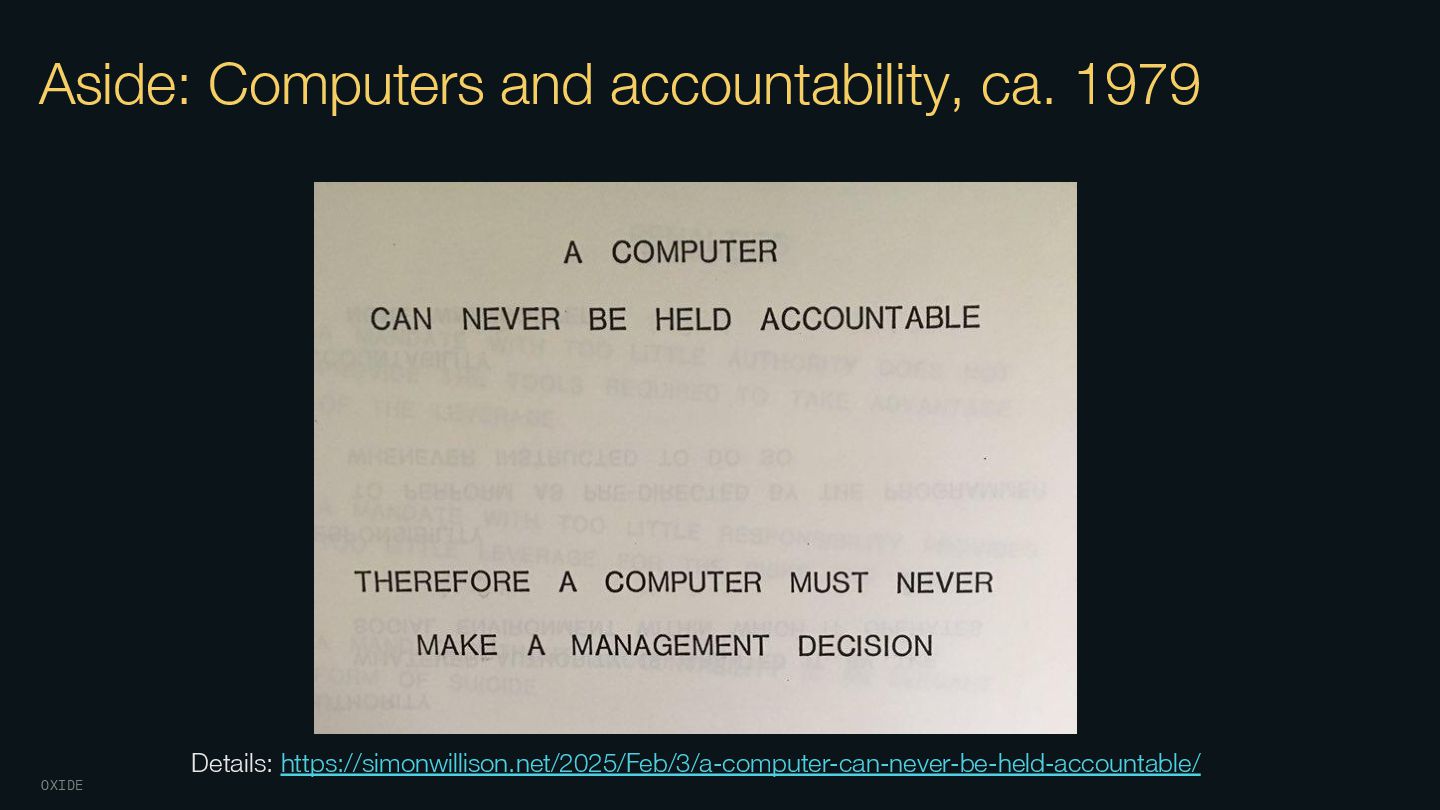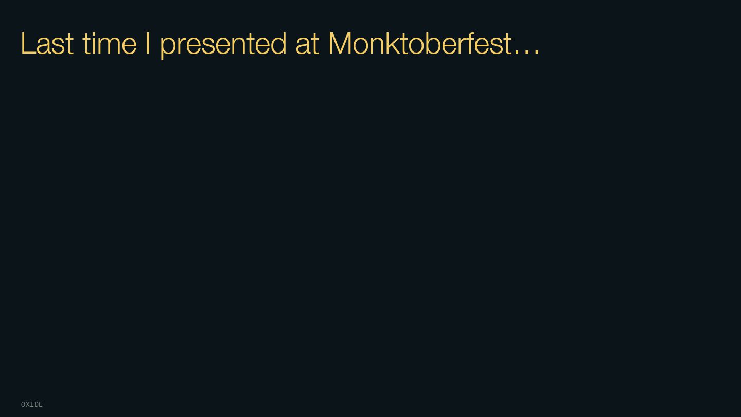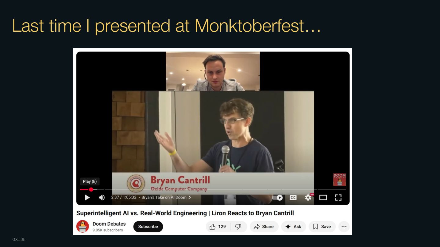 2022 talk, Introspection Gaps • My Monktoberfest 2017 talk, Principles of Technology Leadership • RFD 2 Mission, Principles and Values • RFD 3 Oxide Hiring Process • Oxide and Friends, Reflecting on Founder Mode and RTO or GTFO