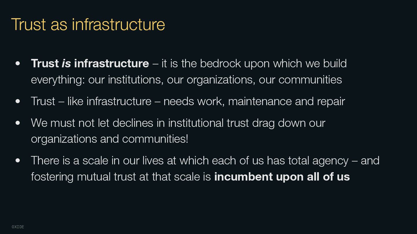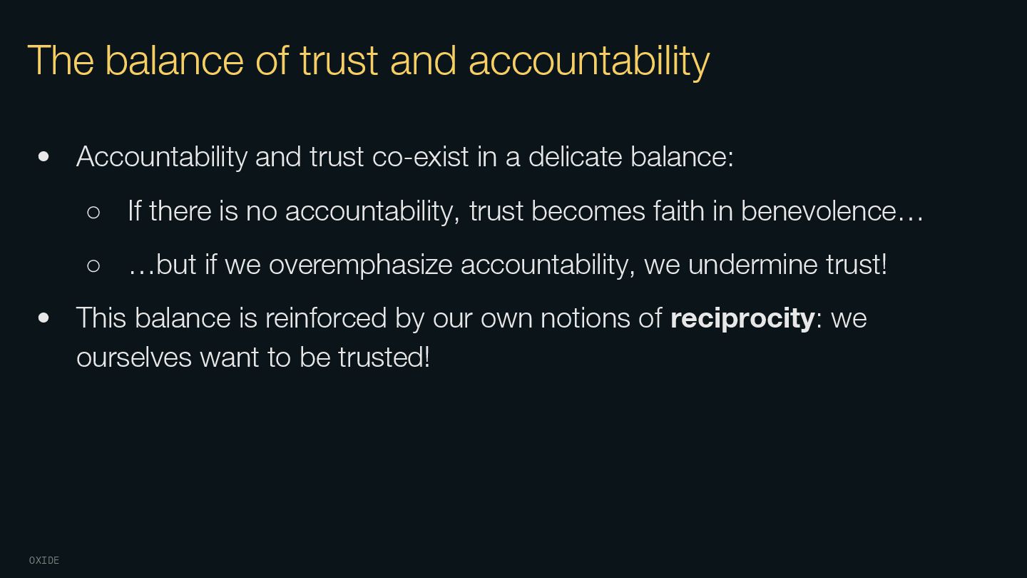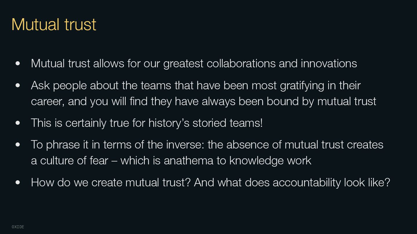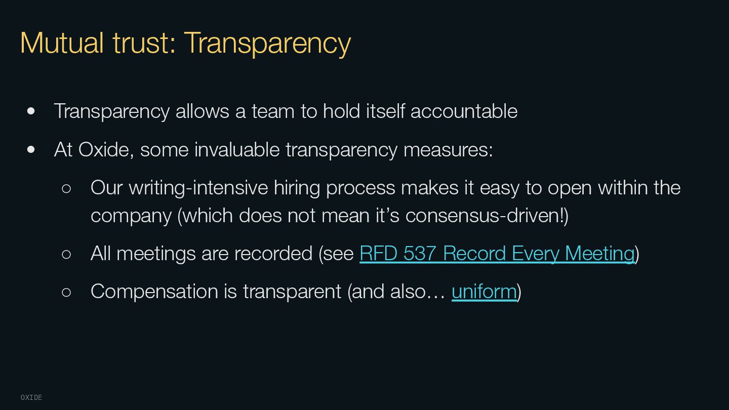 hold itself accountable • At Oxide, some invaluable transparency measures: ◦ Our writing-intensive hiring process makes it easy to open within the company (which does not mean it’s consensus-driven!) ◦ All meetings are recorded (see RFD 537 Record Every Meeting) ◦ Compensation is transparent (and also… uniform)
