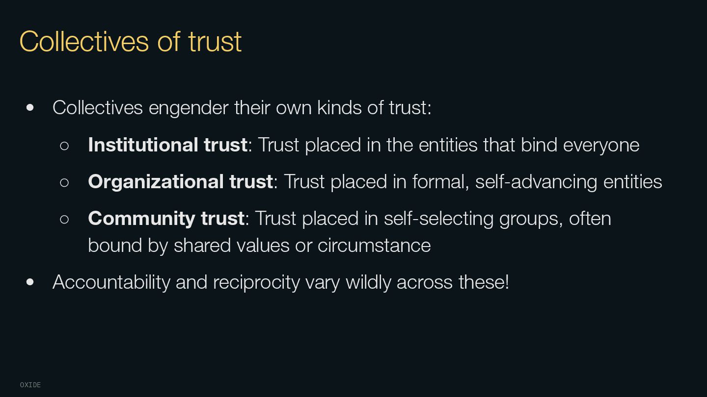 of trust: ◦ Institutional trust: Trust placed in the entities that bind everyone ◦ Organizational trust: Trust placed in formal, self-advancing entities ◦ Community trust: Trust placed in self-selecting groups, often bound by shared values or circumstance • Accountability and reciprocity vary wildly across these!