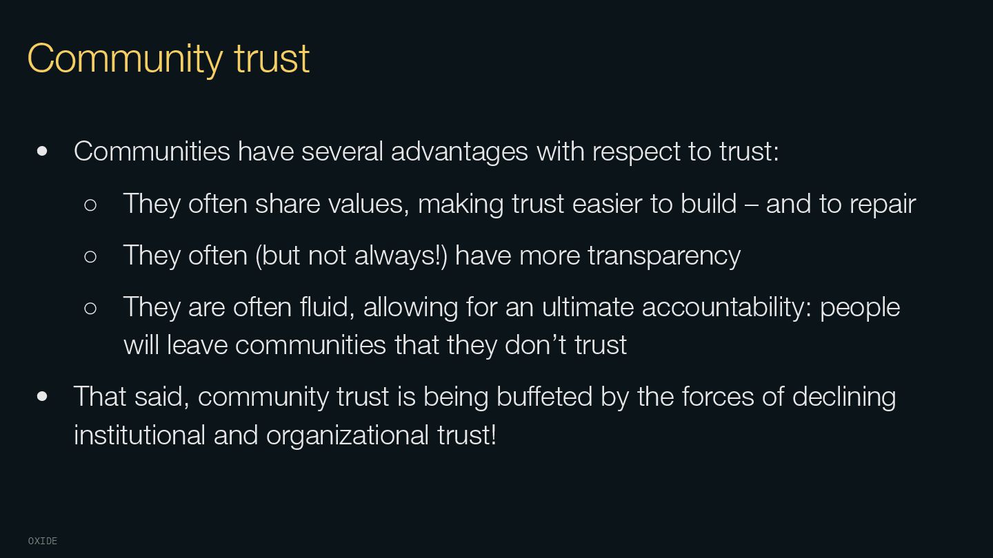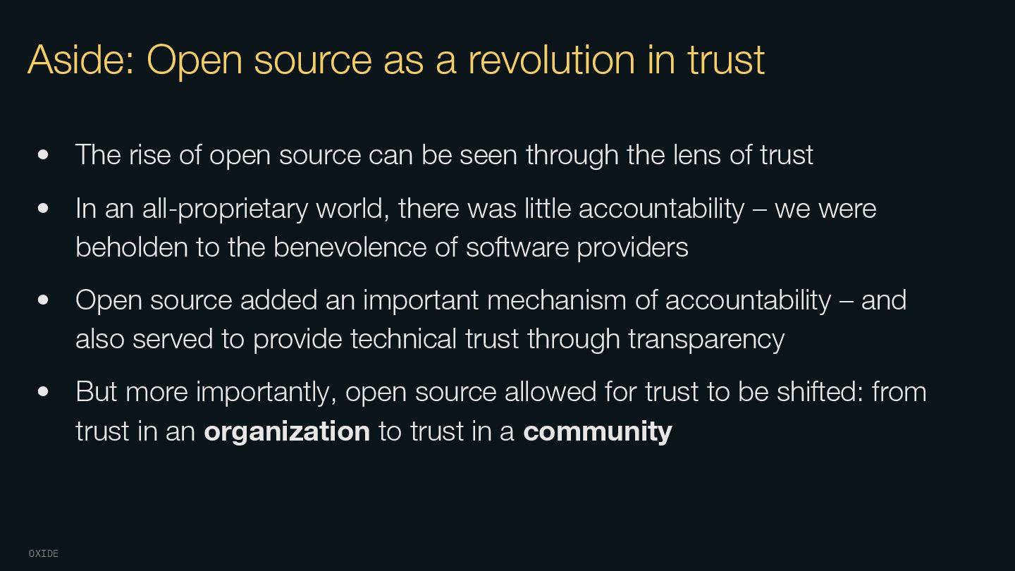 The rise of open source can be seen through the lens of trust • In an all-proprietary world, there was little accountability – we were beholden to the benevolence of software providers • Open source added an important mechanism of accountability – and also served to provide technical trust through transparency • But more importantly, open source allowed for trust to be shifted: from trust in an organization to trust in a community