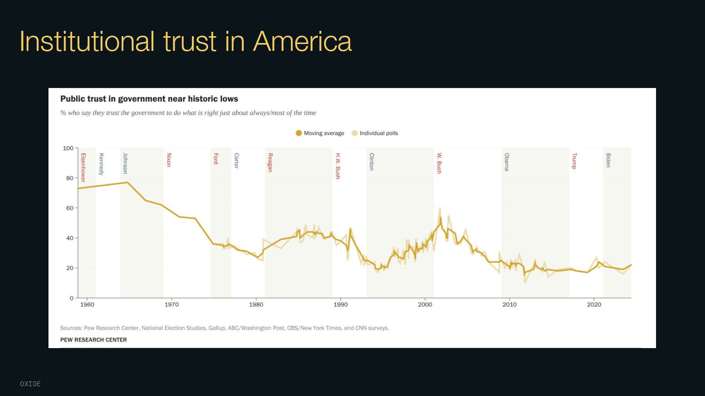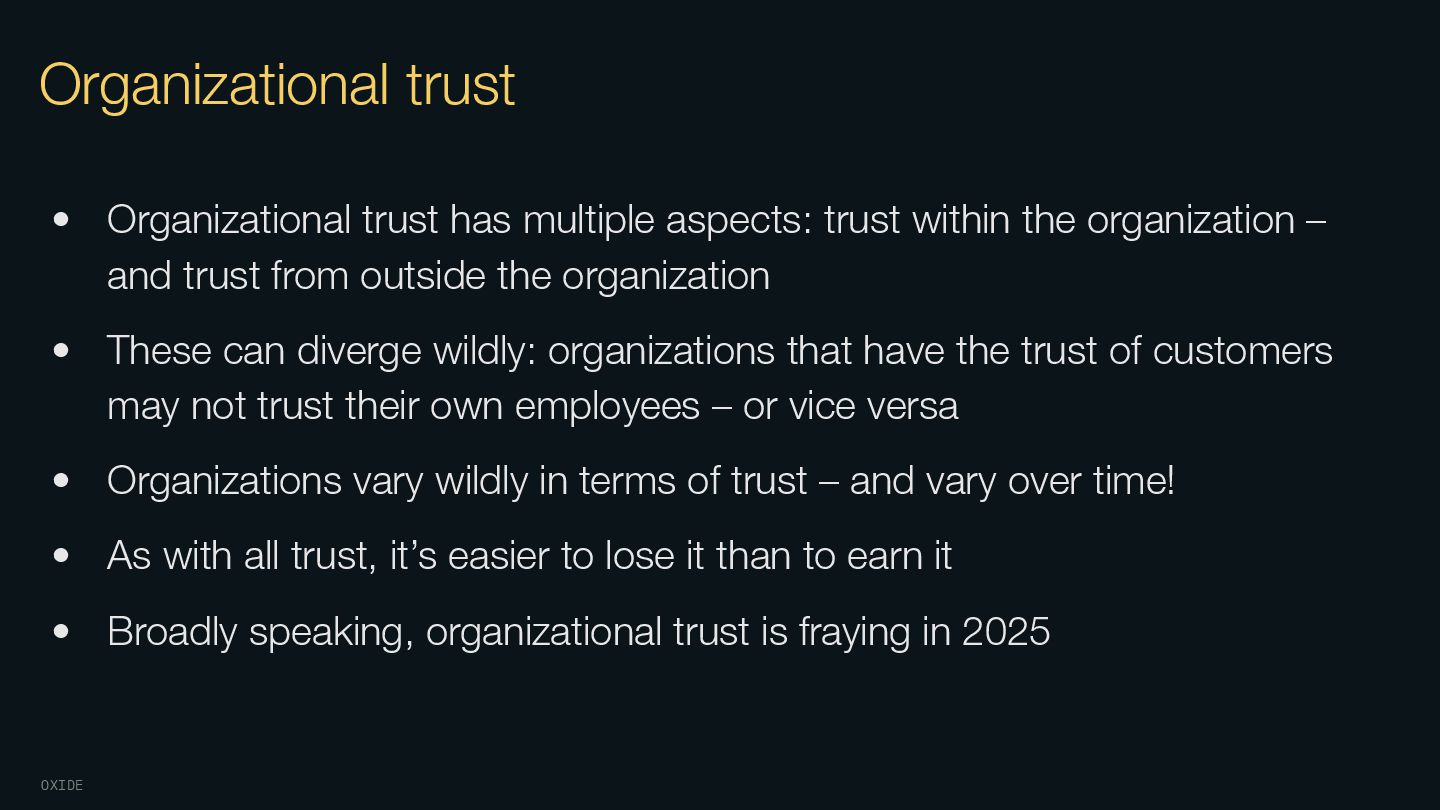within the organization – and trust from outside the organization • These can diverge wildly: organizations that have the trust of customers may not trust their own employees – or vice versa • Organizations vary wildly in terms of trust – and vary over time! • As with all trust, it’s easier to lose it than to earn it • Broadly speaking, organizational trust is fraying in 2025