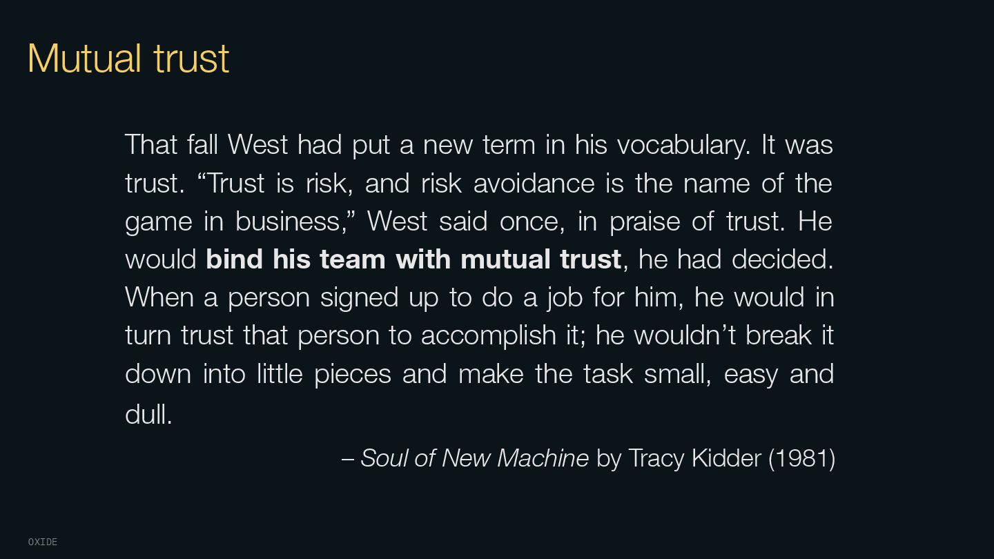 term in his vocabulary. It was trust. “Trust is risk, and risk avoidance is the name of the game in business,” West said once, in praise of trust. He would bind his team with mutual trust, he had decided. When a person signed up to do a job for him, he would in turn trust that person to accomplish it; he wouldn’t break it down into little pieces and make the task small, easy and dull. – Soul of New Machine by Tracy Kidder (1981)