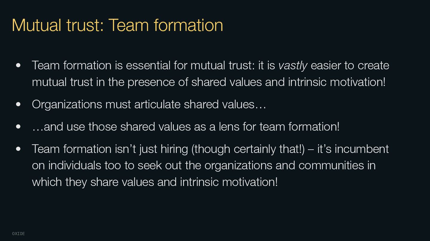 for mutual trust: it is vastly easier to create mutual trust in the presence of shared values and intrinsic motivation! • Organizations must articulate shared values… • …and use those shared values as a lens for team formation! • Team formation isn’t just hiring (though certainly that!) – it’s incumbent on individuals too to seek out the organizations and communities in which they share values and intrinsic motivation!