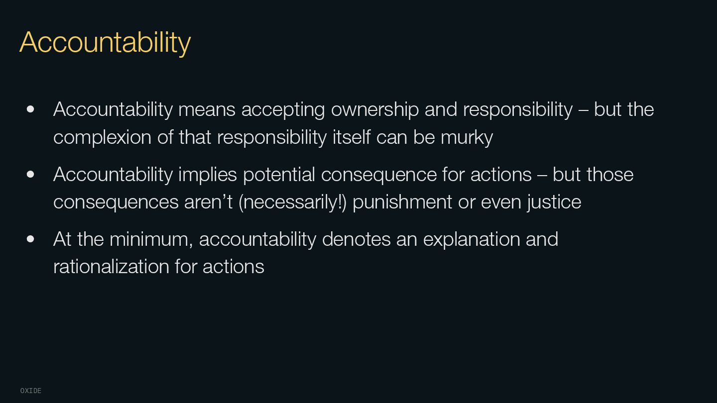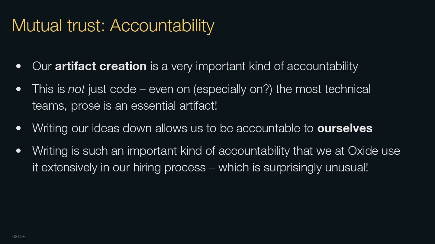 very important kind of accountability • This is not just code – even on (especially on?) the most technical teams, prose is an essential artifact! • Writing our ideas down allows us to be accountable to ourselves • Writing is such an important kind of accountability that we at Oxide use it extensively in our hiring process – which is surprisingly unusual!