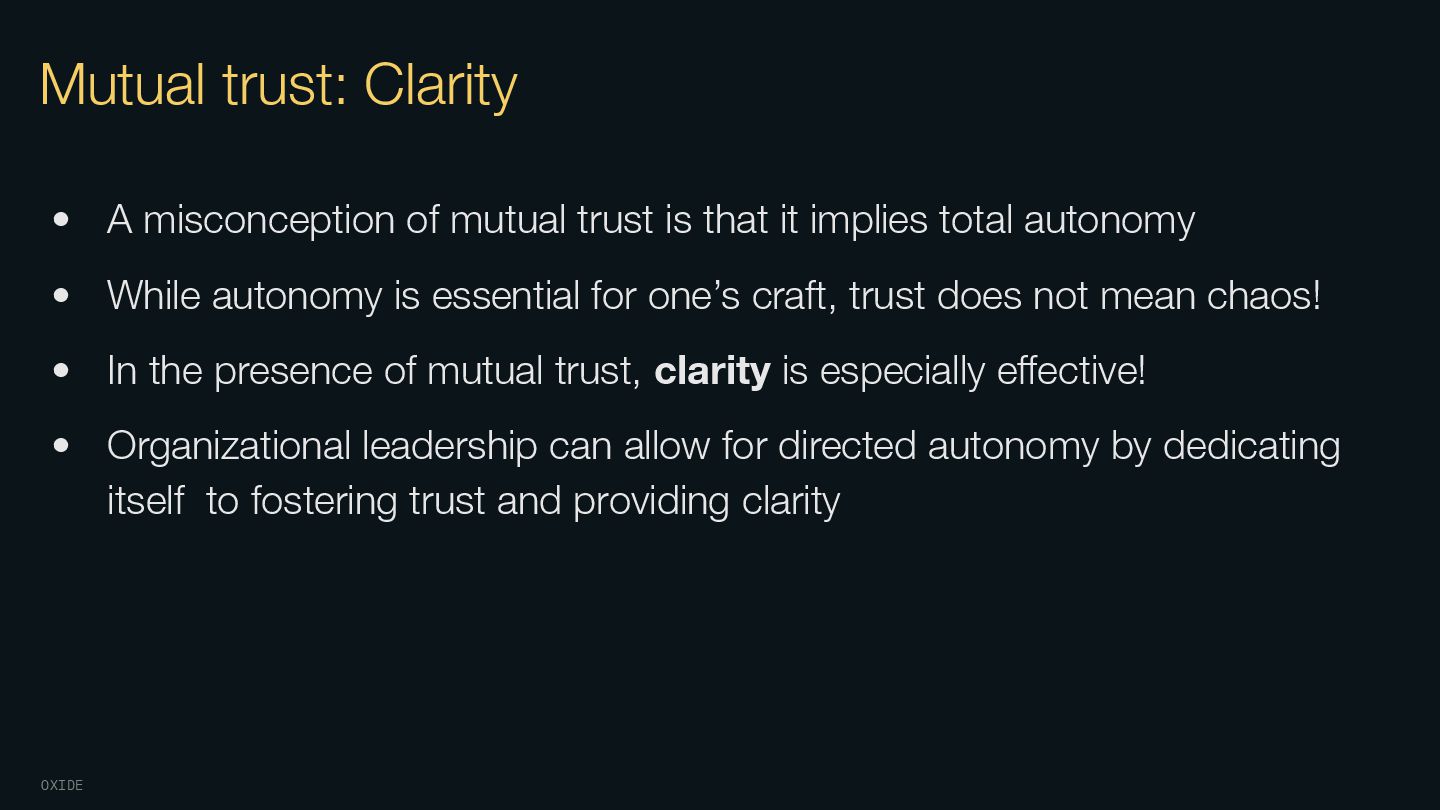is that it implies total autonomy • While autonomy is essential for one’s craft, trust does not mean chaos! • In the presence of mutual trust, clarity is especially effective! • Organizational leadership can allow for directed autonomy by dedicating itself to fostering trust and providing clarity
