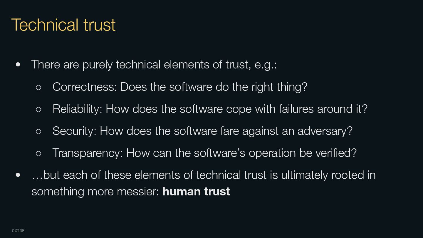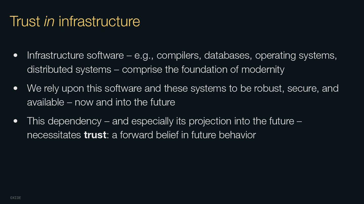 databases, operating systems, distributed systems – comprise the foundation of modernity • We rely upon this software and these systems to be robust, secure, and available – now and into the future • This dependency – and especially its projection into the future – necessitates trust: a forward belief in future behavior