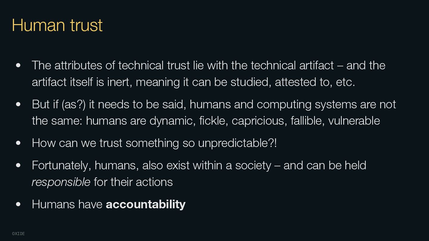 with the technical artifact – and the artifact itself is inert, meaning it can be studied, attested to, etc. • But if (as?) it needs to be said, humans and computing systems are not the same: humans are dynamic, fickle, capricious, fallible, vulnerable • How can we trust something so unpredictable?! • Fortunately, humans, also exist within a society – and can be held responsible for their actions • Humans have accountability