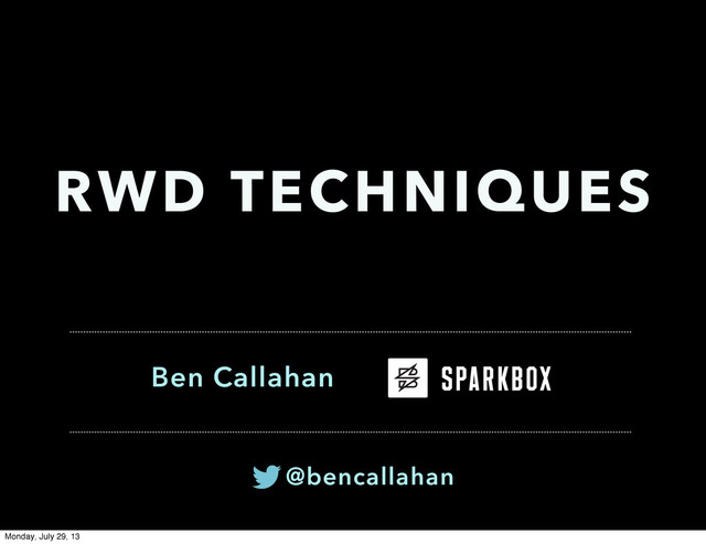 Decrease the number of requests ‣ Gzip if you can ‣ Concat and minify CSS/JS ‣ Load CSS at the top ‣ Load JS at the bottom ‣ Follow @souders on Twitter Monday, July 29, 13