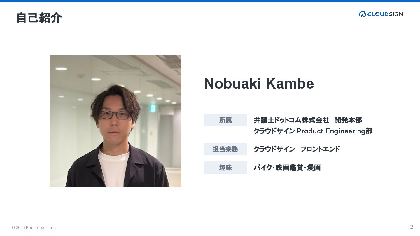 1. © 2025 Bengo4.com, inc. 自己紹介 Nobuaki Kambe 所属 弁護士ドットコム株式会社 開発本部