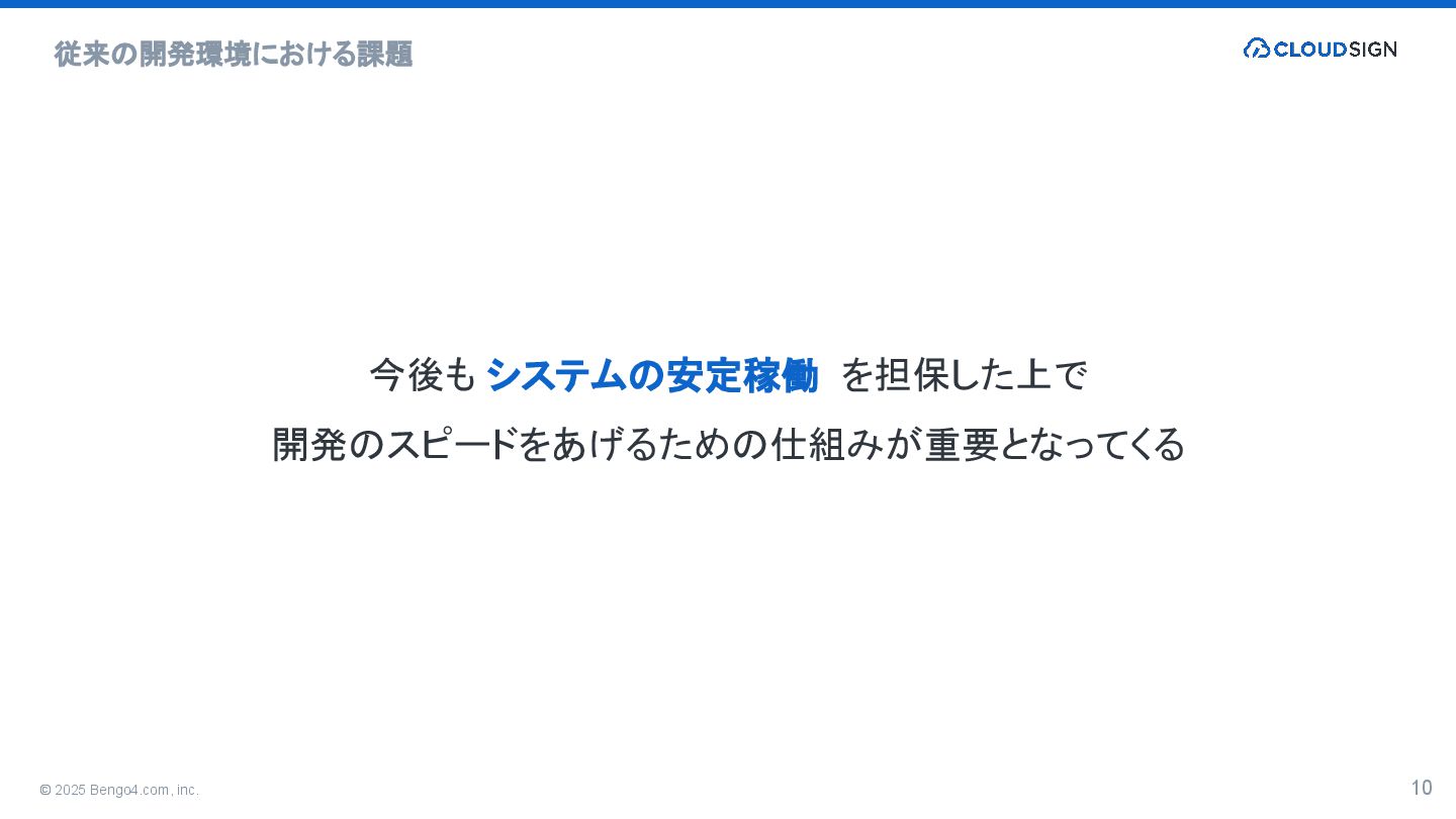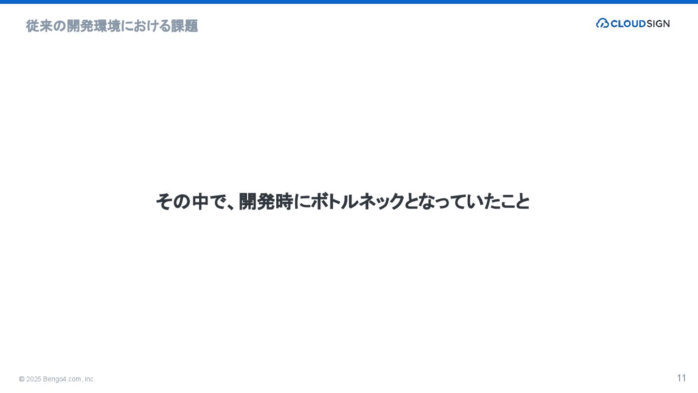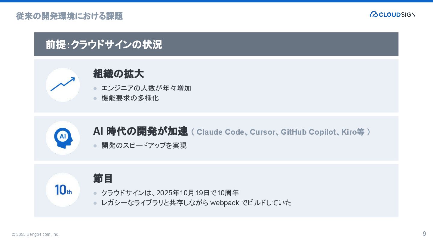 時代の開発が加速 ( Claude Code、Cursor、GitHub Copilot、Kiro等 ) • 開発のスピードアップを実現 前提:クラウドサインの状況 • クラウドサインは、2025年10月19日で10周年 • レガシーなライブラリと共存しながら webpack でビルドしていた 従来の開発環境における課題 9 節目