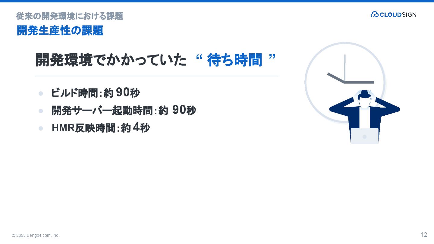 • 1日に複数回デプロイするため、トータルでのタイムロスが大きい 課 題 従来の開発環境における課題 開発生産性の課題 開発環境でかかっていた “ 待ち時間 ” • ビルド時間:約 90秒 • 開発サーバー起動時間:約 90秒 • HMR反映時間:約 4秒