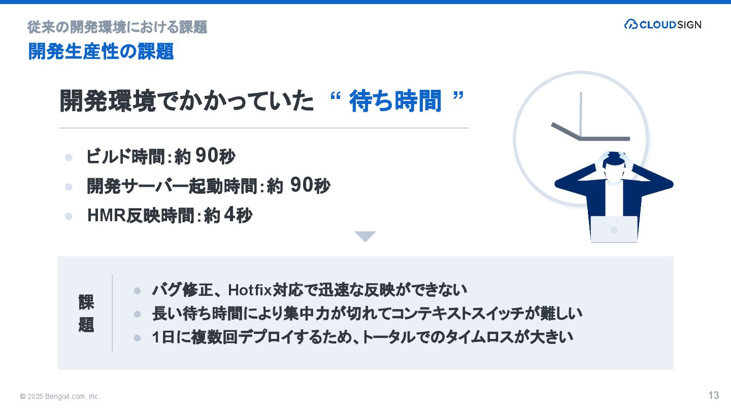 7. © 2025 Bengo4.com, inc. 13 • バグ修正、 Hotfix対応で迅速な反映ができない • 長い待ち時間により集中力が切れてコンテキストスイッチが難しい