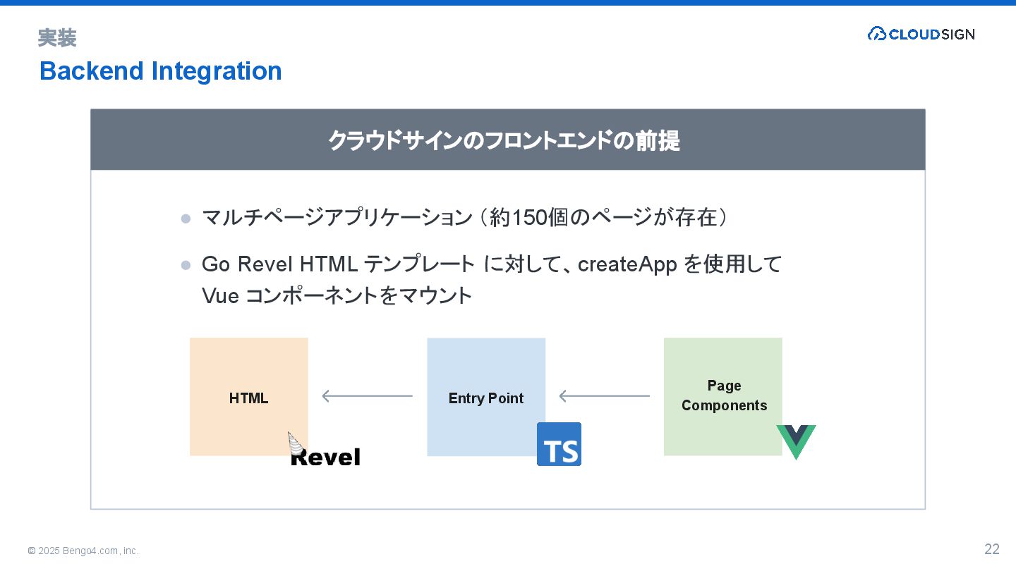 HTML テンプレート に対して、createApp を使用して Vue コンポーネントをマウント 22 実装 クラウドサインのフロントエンドの前提 HTML Entry Point Page Components Backend Integration