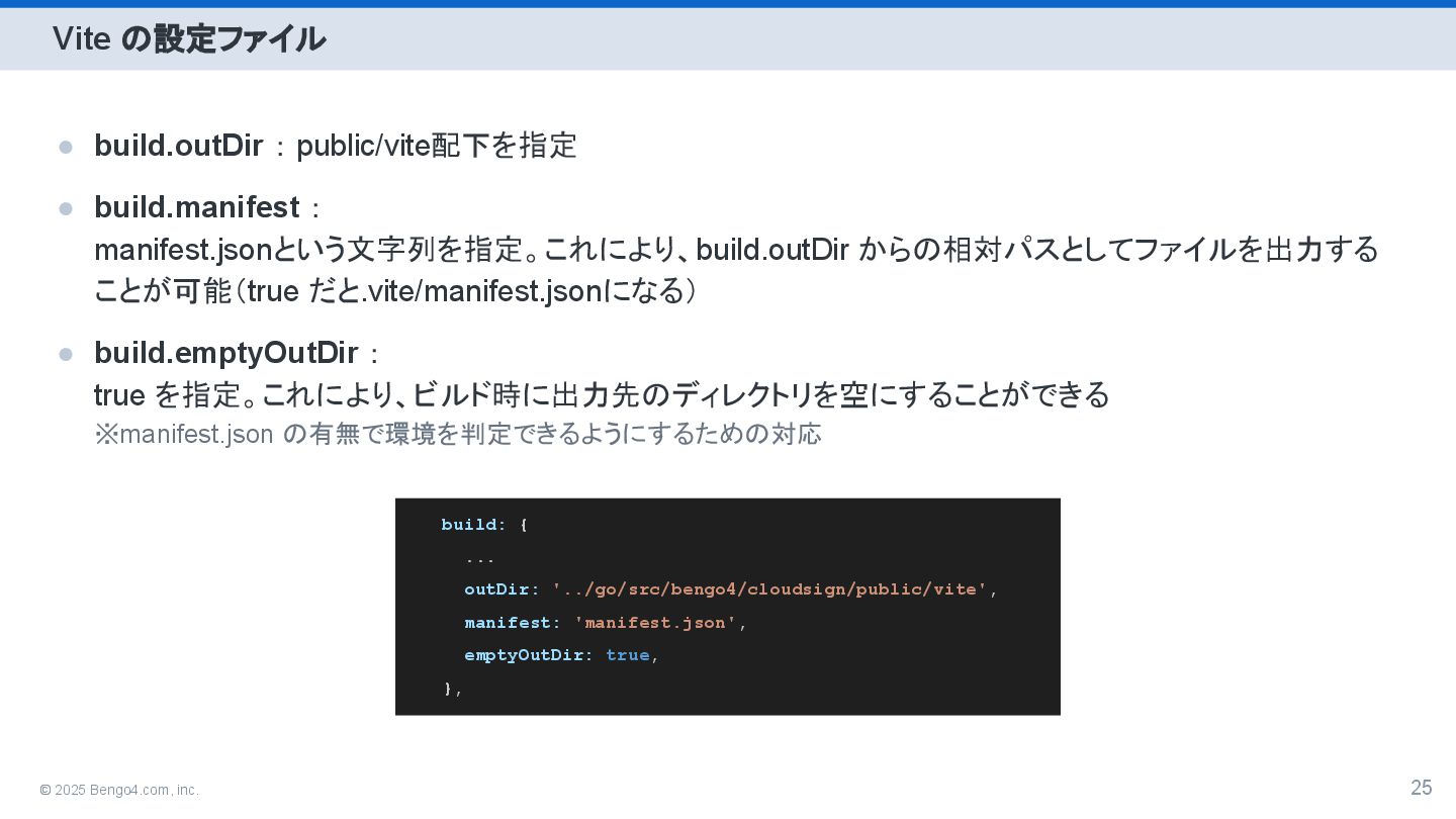 13. © 2025 Bengo4.com, inc. 25 • build.outDir : public/vite配下を指定 •