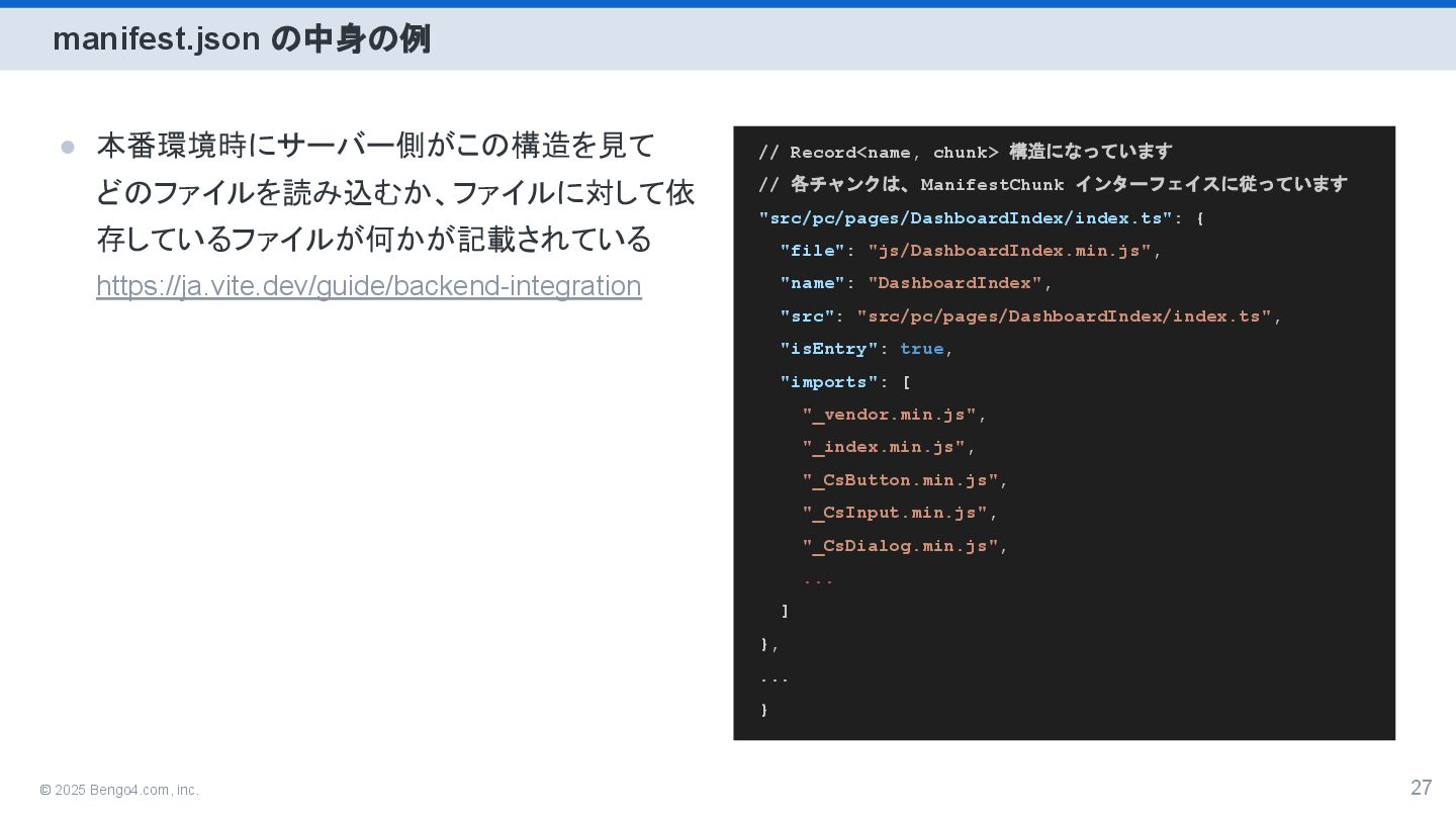 存しているファイルが何かが記載されている https://ja.vite.dev/guide/backend-integration // Record<name, chunk> 構造になっています // 各チャンクは、 ManifestChunk インターフェイスに従っています "src/pc/pages/DashboardIndex/index.ts": { "file": "js/DashboardIndex.min.js", "name": "DashboardIndex", "src": "src/pc/pages/DashboardIndex/index.ts", "isEntry": true, "imports": [ "_vendor.min.js", "_index.min.js", "_CsButton.min.js", "_CsInput.min.js", "_CsDialog.min.js", ... ] }, ... }