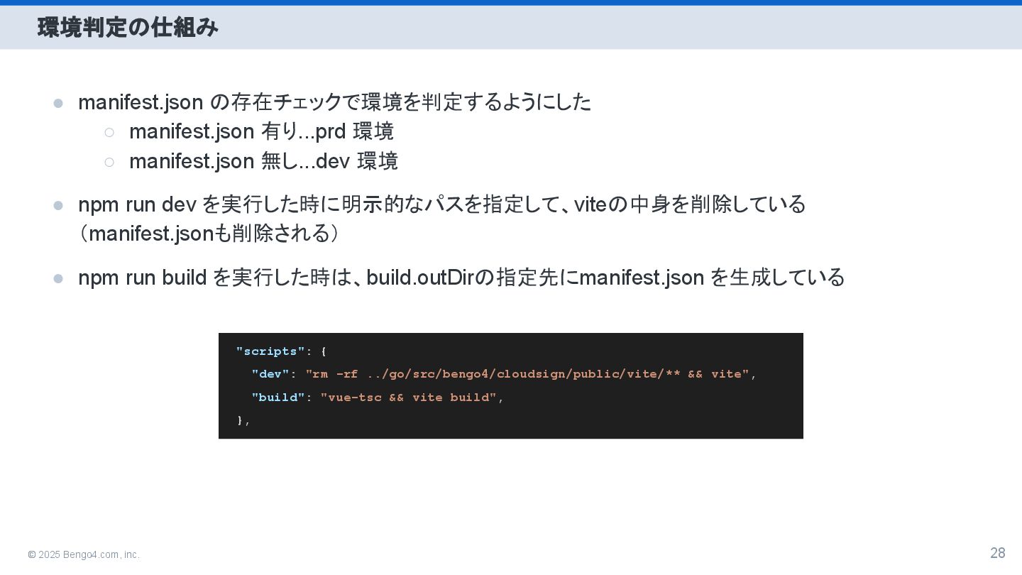 ../go/src/bengo4/cloudsign/public/vite/** && vite", "build": "vue-tsc && vite build", }, 環境判定の仕組み • manifest.json の存在チェックで環境を判定するようにした ◦ manifest.json 有り...prd 環境 ◦ manifest.json 無し...dev 環境 • npm run dev を実行した時に明示的なパスを指定して、viteの中身を削除している (manifest.jsonも削除される) • npm run build を実行した時は、build.outDirの指定先にmanifest.json を生成している