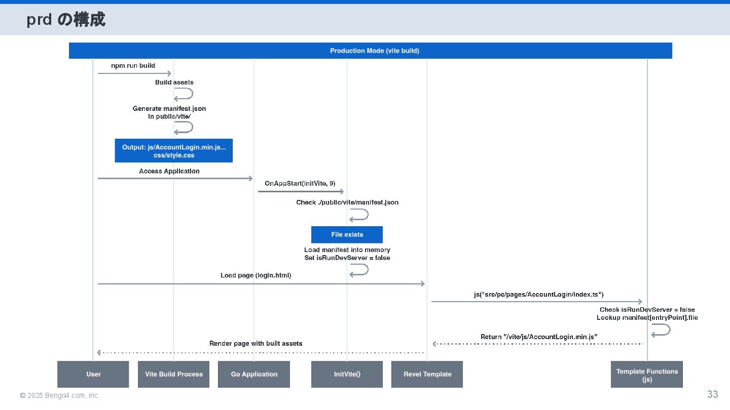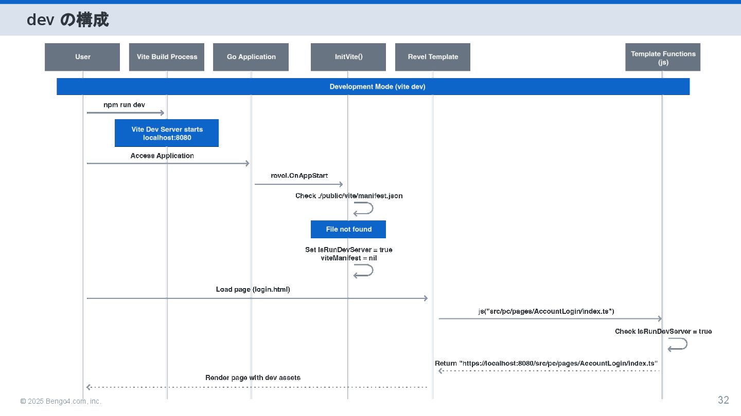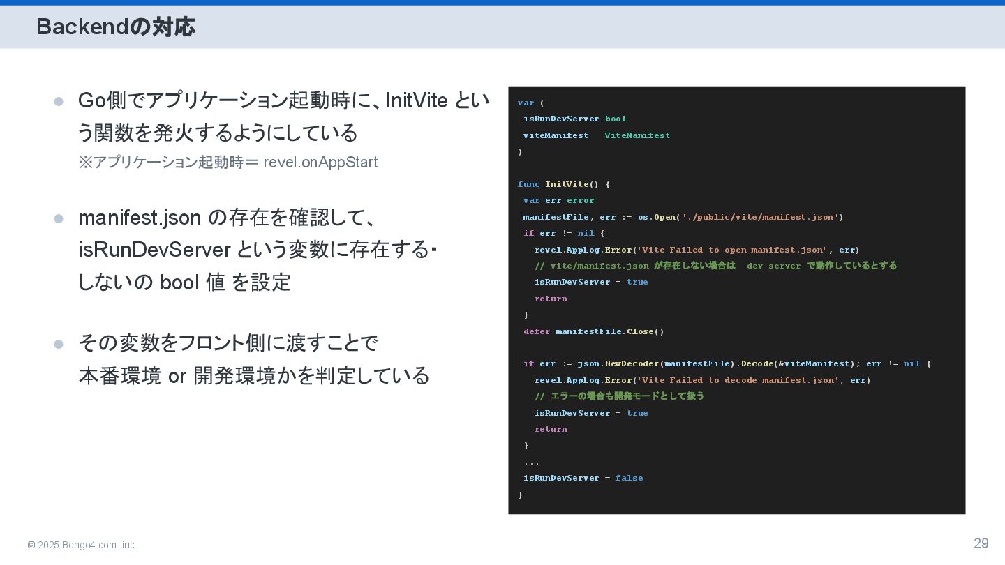 ※アプリケーション起動時= revel.onAppStart • manifest.json の存在を確認して、 isRunDevServer という変数に存在する・ しないの bool 値 を設定 • その変数をフロント側に渡すことで 本番環境 or 開発環境かを判定している var ( isRunDevServer bool viteManifest ViteManifest ) func InitVite() { var err error manifestFile, err := os.Open("./public/vite/manifest.json") if err != nil { revel.AppLog.Error("Vite Failed to open manifest.json", err) // vite/manifest.json が存在しない場合は dev server で動作しているとする isRunDevServer = true return } defer manifestFile.Close() if err := json.NewDecoder(manifestFile).Decode(&viteManifest); err != nil { revel.AppLog.Error("Vite Failed to decode manifest.json", err) // エラーの場合も開発モードとして扱う isRunDevServer = true return } ... isRunDevServer = false }