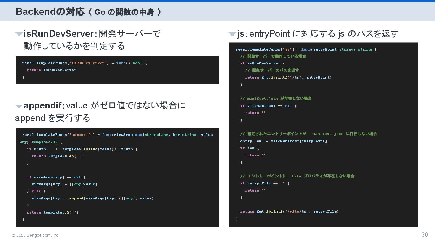{ // 開発サーバーで動作している場合 if isRunDevServer { // 開発サーバーのパスを返す return fmt.Sprintf("/%s", entryPoint) } // manifest.json が存在しない場合 if viteManifest == nil { return "" } // 指定されたエントリーポイントが manifest.json に存在しない場合 entry, ok := viteManifest[entryPoint] if !ok { return "" } // エントリーポイントに file プロパティが存在しない場合 if entry.File == "" { return "" } return fmt.Sprintf("/vite/%s", entry.File) }   js:entryPoint に対応する js のパスを返す Backendの対応 〈 Go の関数の中身 〉   isRunDevServer:開発サーバーで   動作しているかを判定する   appendif:value がゼロ値ではない場合に     append を実行する revel.TemplateFuncs["appendif"] = func(viewArgs map[string]any, key string, value any) template.JS { if truth, _ := template.IsTrue(value); !truth { return template.JS("") } if viewArgs[key] == nil { viewArgs[key] = []any{value} } else { viewArgs[key] = append(viewArgs[key].([]any), value) } return template.JS("") } revel.TemplateFuncs["isRunDevServer"] = func() bool { return isRunDevServer }