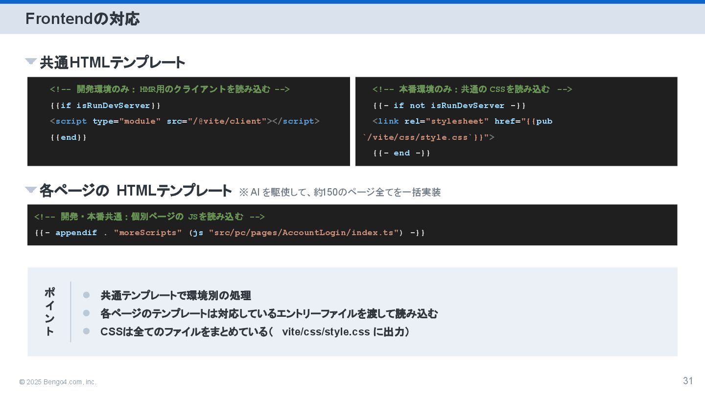appendif . "moreScripts" (js "src/pc/pages/AccountLogin/index.ts") -}} Frontendの対応   共通HTMLテンプレート   各ページの HTMLテンプレート ※ AI を駆使して、約150のページ全てを一括実装 <!-- 本番環境のみ:共通の CSSを読み込む --> {{- if not isRunDevServer -}} <link rel="stylesheet" href="{{pub `/vite/css/style.css`}}"> {{- end -}} <!-- 開発環境のみ: HMR用のクライアントを読み込む --> {{if isRunDevServer}} <script type="module" src="/@vite/client"></script> {{end}} • 共通テンプレートで環境別の処理 • 各ページのテンプレートは対応しているエントリーファイルを渡して読み込む • CSSは全てのファイルをまとめている( vite/css/style.css に出力) ポ イ ン ト