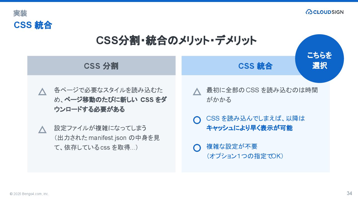CSS 分割 各ページで必要なスタイルを読み込むた め、ページ移動のたびに新しい CSS をダ ウンロードする必要がある 設定ファイルが複雑になってしまう (出力された manifest.json の中身を見 て、依存している css を取得...) 最初に全部の CSS を読み込むのは時間 がかかる 複雑な設定が不要 (オプション1つの指定でOK) CSS を読み込んでしまえば、以降は キャッシュにより早く表示が可能 こちらを 選択 CSS分割・統合のメリット・デメリット