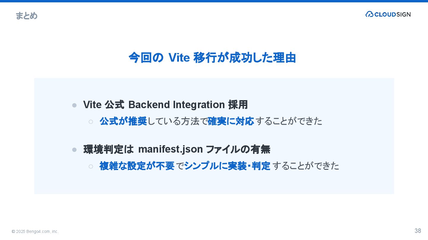 ◦ 公式が推奨している方法で確実に対応することができた • 環境判定は manifest.json ファイルの有無 ◦ 複雑な設定が不要でシンプルに実装・判定 することができた 38 今回の Vite 移行が成功した理由 まとめ