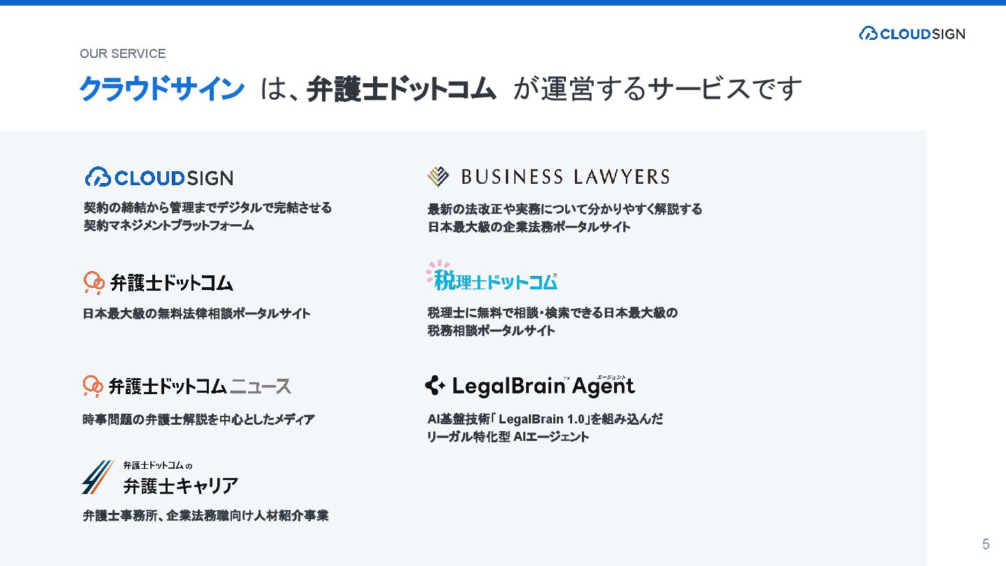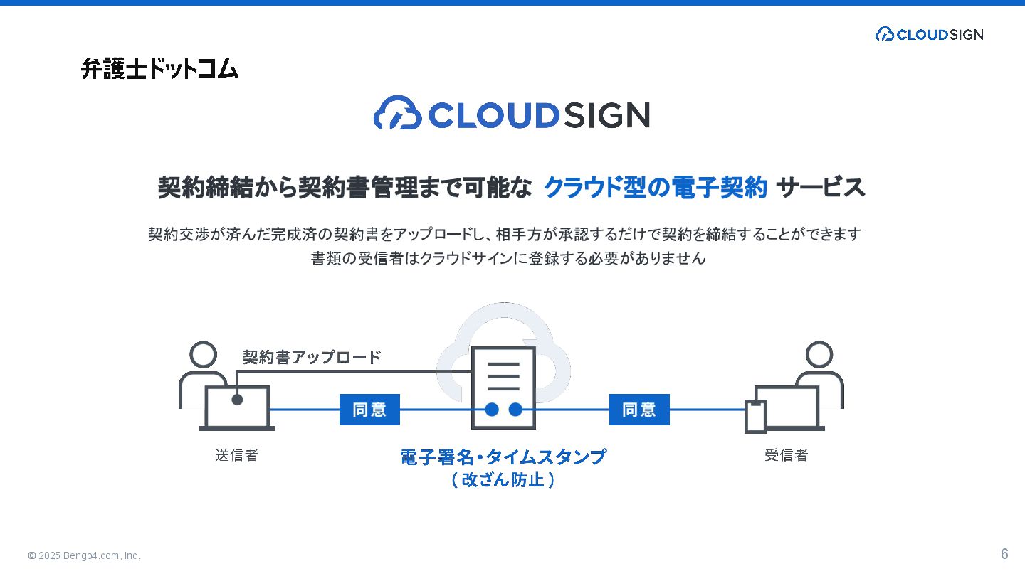 日本最大級の企業法務ポータルサイト クラウドサイン は、弁護士ドットコム が運営するサービスです OUR SERVICE AI基盤技術「 LegalBrain 1.0」を組み込んだ リーガル特化型 AIエージェント 契約の締結から管理までデジタルで完結させる 契約マネジメントプラットフォーム 時事問題の弁護士解説を中心としたメディア 日本最大級の無料法律相談ポータルサイト 弁護士事務所、企業法務職向け人材紹介事業