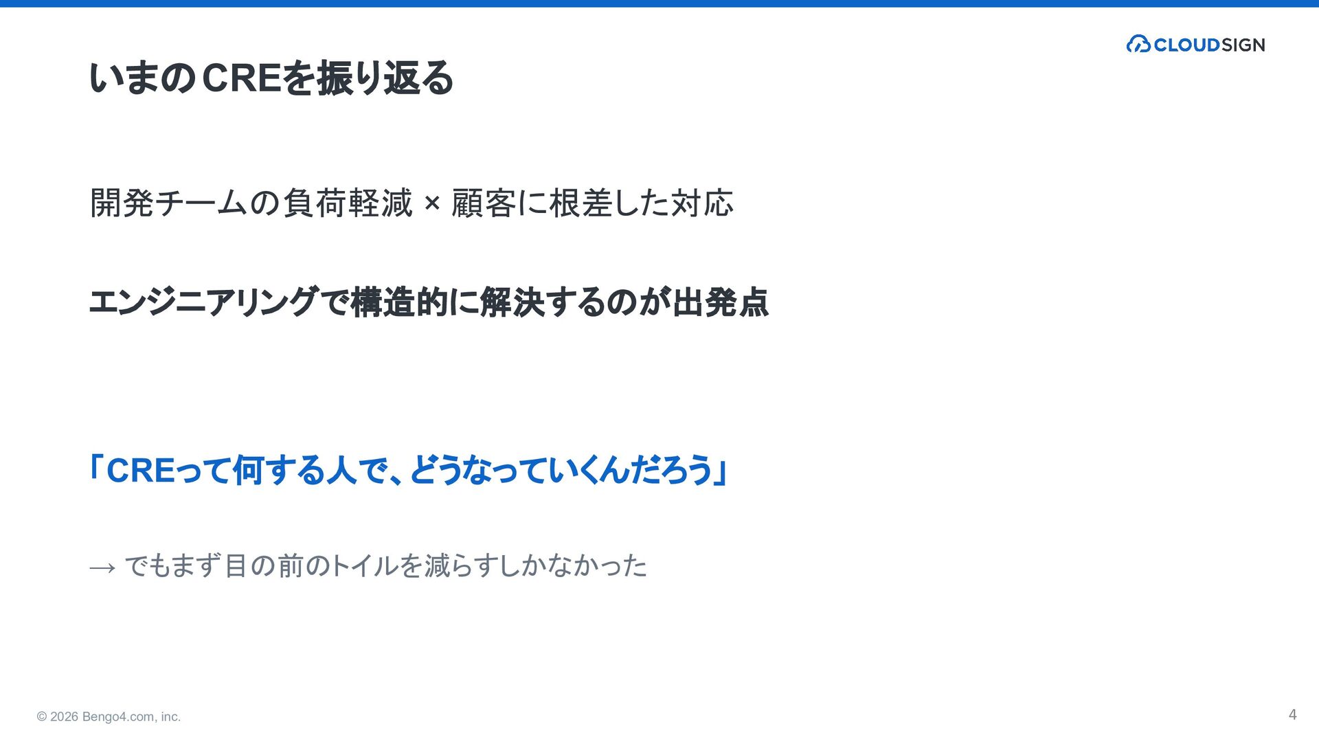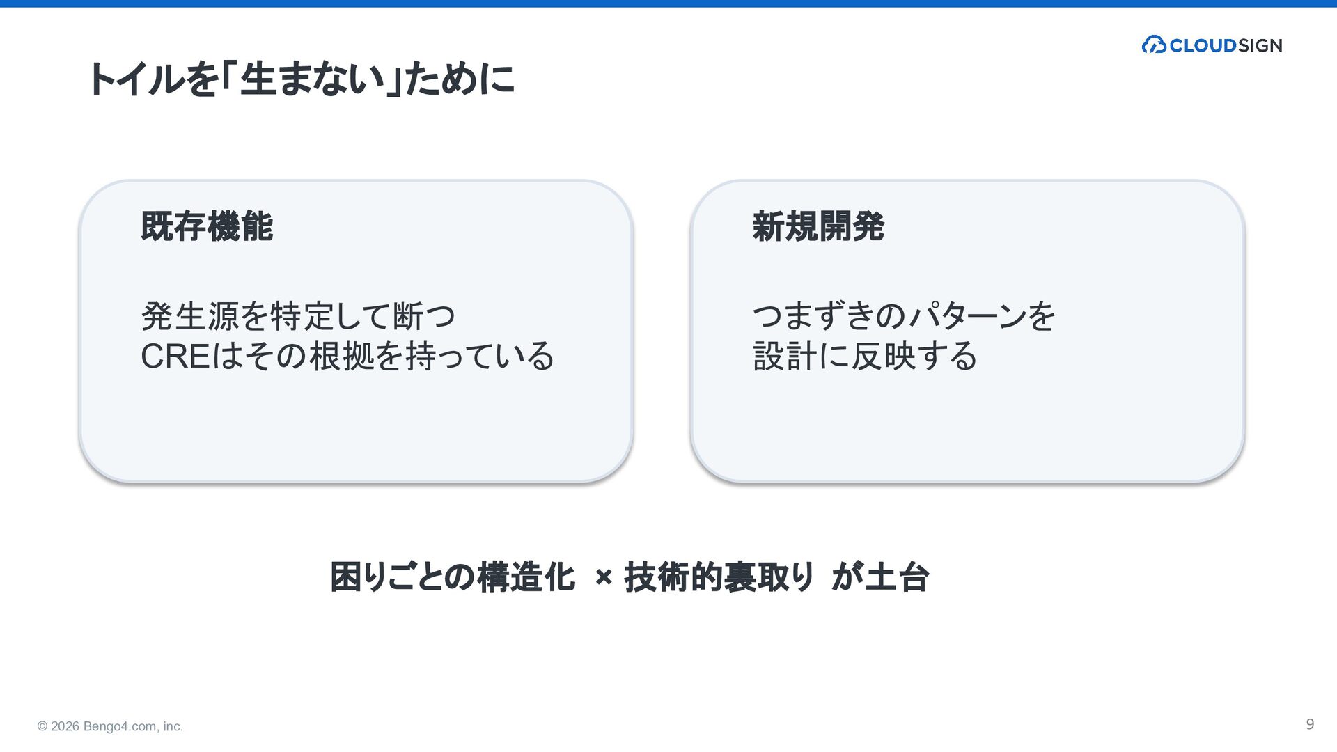 4. © 2026 Bengo4.com, inc. 9 トイルを「生まない」ために 既存機能 発生源を特定して断つ CREはその根拠を持っている 新規開発