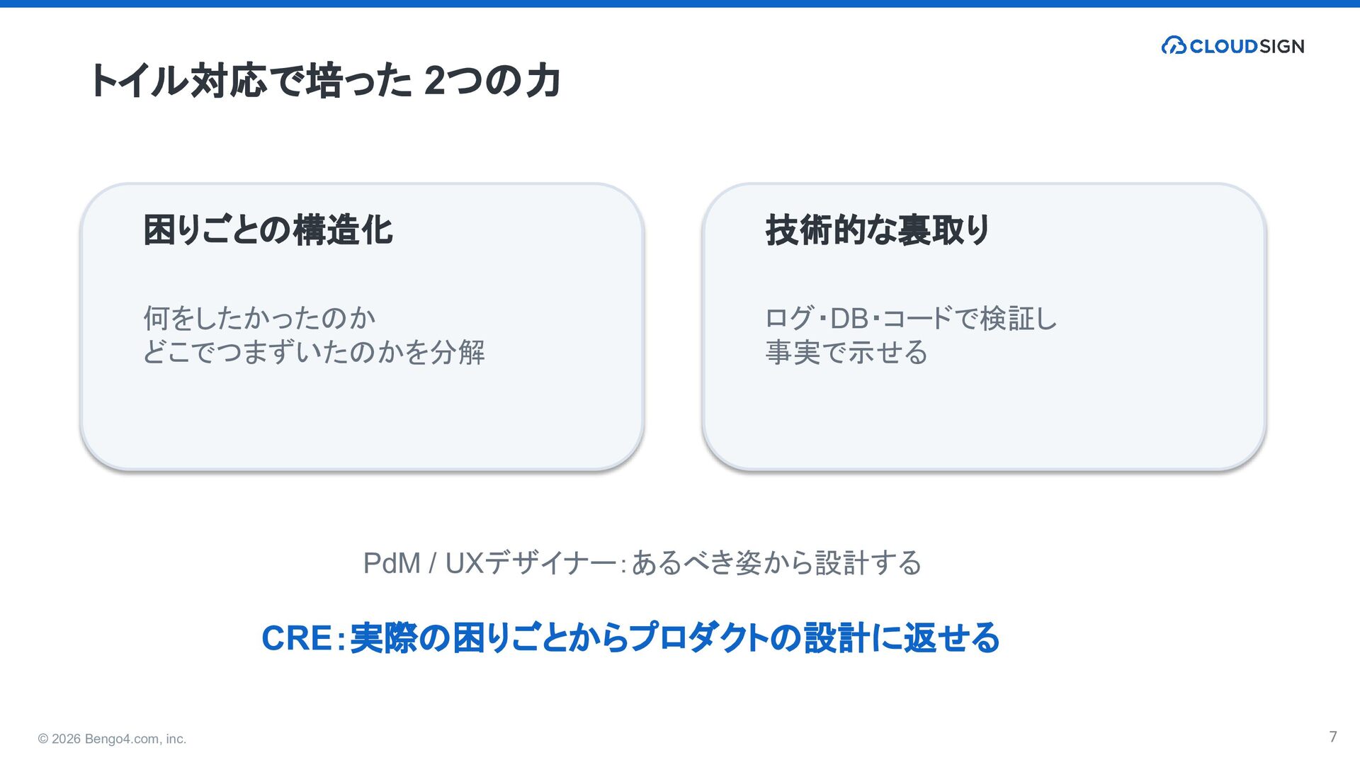 3. © 2026 Bengo4.com, inc. 7 トイル対応で培った 2つの力 困りごとの構造化 何をしたかったのか どこでつまずいたのかを分解
