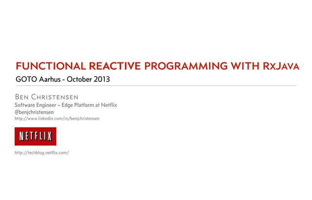 RxJava is a library for composing asynchronous and event-based programs by using observable sequences for the Java VM. It supports Java 6+, Clojure, Scala, Groovy, JRuby, and Java 8 lambdas. In this session, learn how the Netflix API uses RxJava to implement highly concurrent Web services against asynchronous datasources without blocking, synchronization, or thread safety concerns by using declarative functional reactive composition.