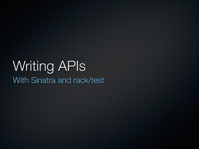 "base" do it "responds with JSON at the root" do browser.get("/") should_200({message: "Welcome to the API"}) should_be_json end end end gist.github.com/4226520