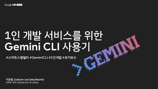 This presentation shares the journey of developing and maintaining "Smart Spam Filter," an AI-powered spam blocking app service, using Gemini CLI. The speaker, Junbum Lee (Beomi), an AI/ML GDE and researcher at Lablup, discusses how he leveraged Gemini CLI to efficiently manage a service with over 100,000 users as a solo developer.