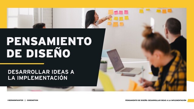CODEMOTION Qué Exactamente Es el Pensamiento de Diseño? Un conjunto de metodologías y acercamientos basados en el principio de “Diseño centrado en el Usuario” para crear un sistema de solución de problemas. Aprovechamos el Pensamiento de Diseño para mejorar la experiencia de la gente cuando interactúa con un producto, servicio, o plataforma. Los resultados de usar este sistema creará una experiencia que es accesible, creíble, usable, navegable, deseable, útil, y en esencia, valuable.