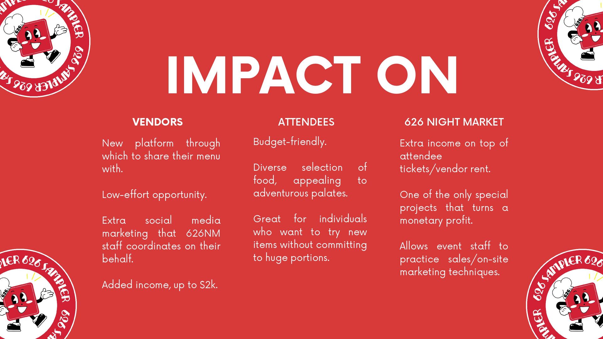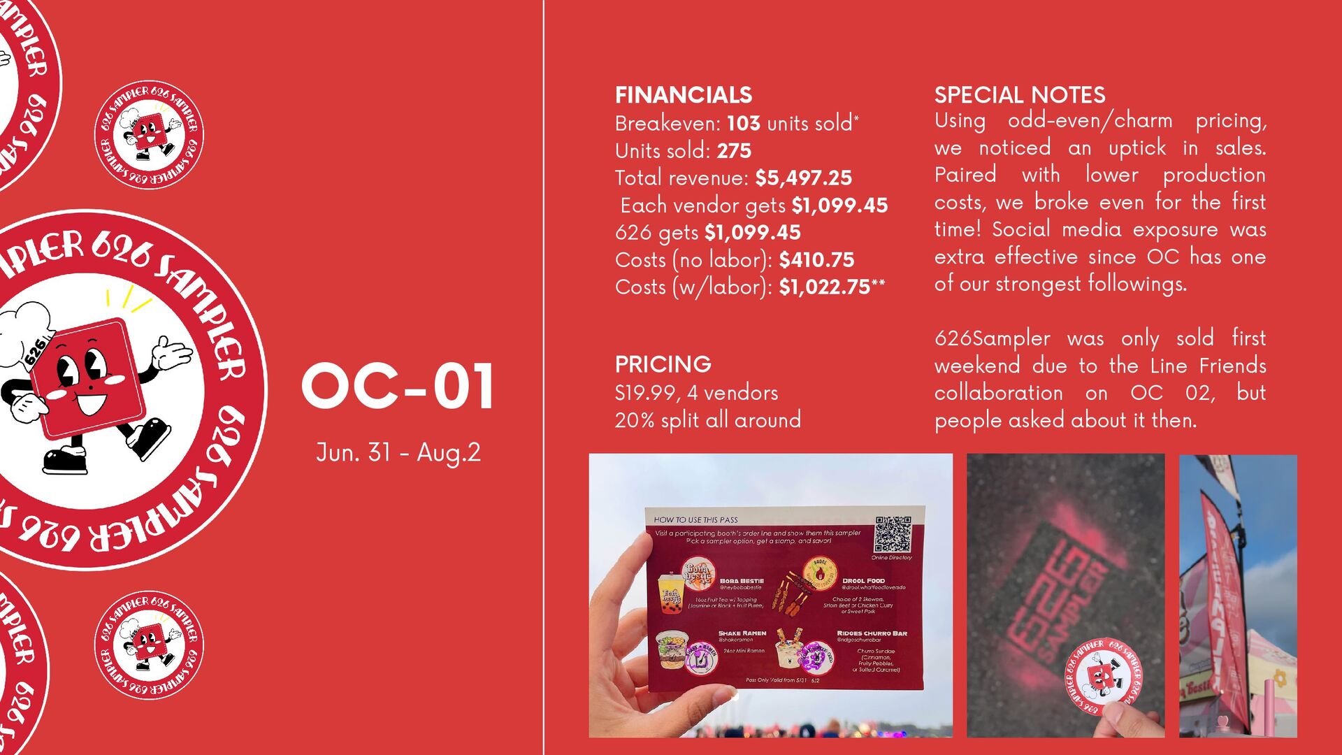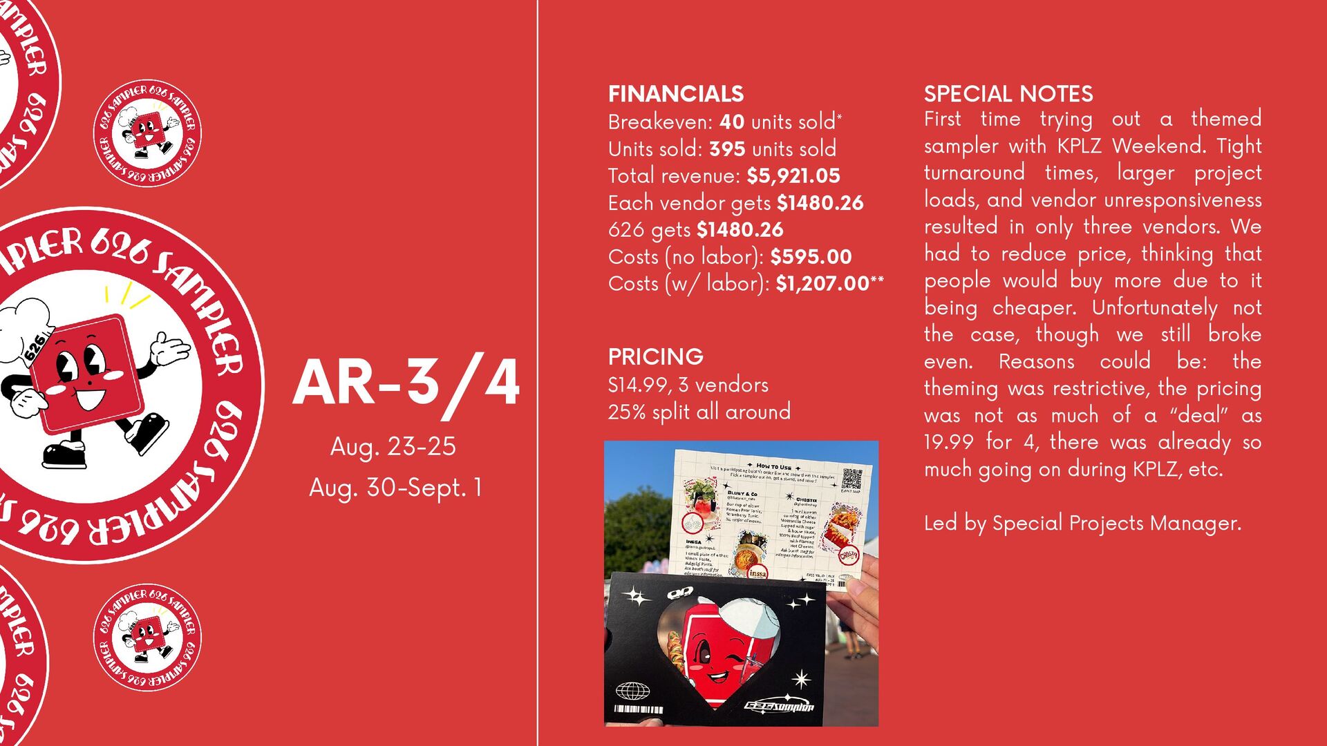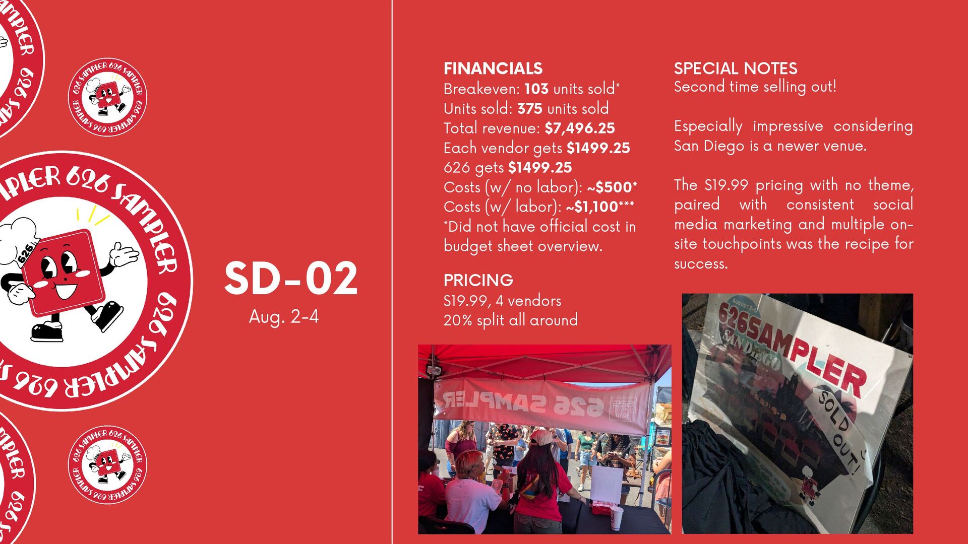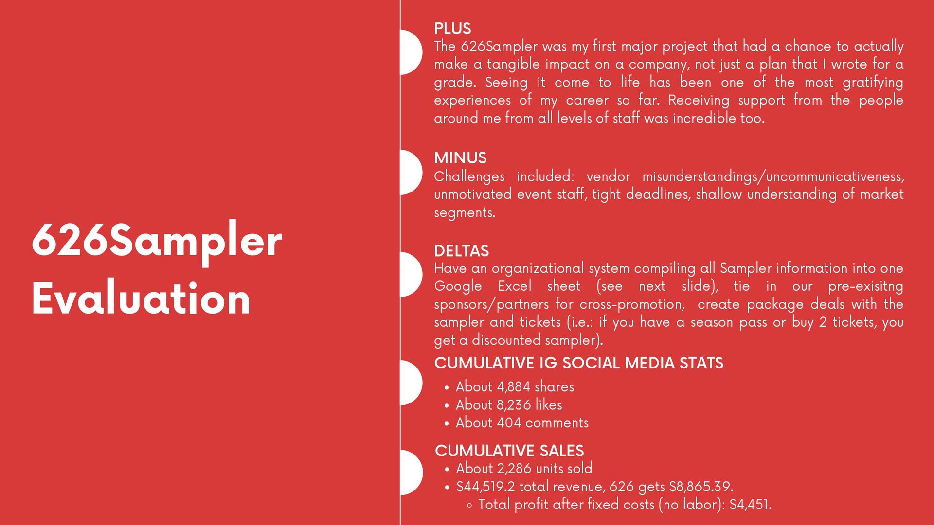 deadlines, shallow understanding of market segments. MINUS Have an organizational system compiling all Sampler information into one Google Excel sheet (see next slide), tie in our pre-exisitng sponsors/partners for cross-promotion, create package deals with the sampler and tickets (i.e.: if you have a season pass or buy 2 tickets, you get a discounted sampler). DELTAS PLUS The 626Sampler was my first major project that had a chance to actually make a tangible impact on a company, not just a plan that I wrote for a grade. Seeing it come to life has been one of the most gratifying experiences of my career so far. Receiving support from the people around me from all levels of staff was incredible too. About 4,884 shares About 8,236 likes About 404 comments CUMULATIVE IG SOCIAL MEDIA STATS CUMULATIVE SALES About 2,286 units sold $44,519.2 total revenue, 626 gets $8,865.39. Total profit after fixed costs (no labor): $4,451.