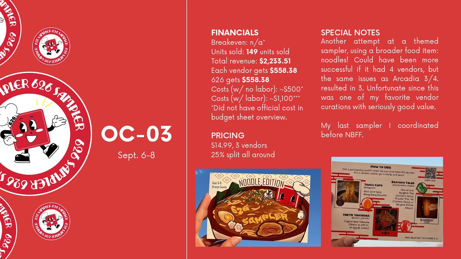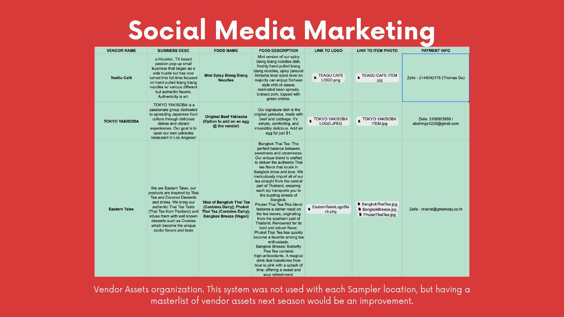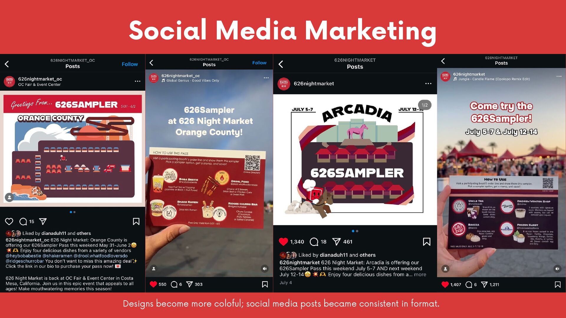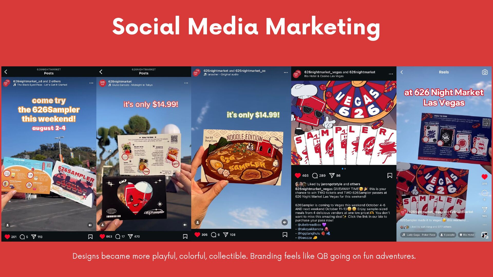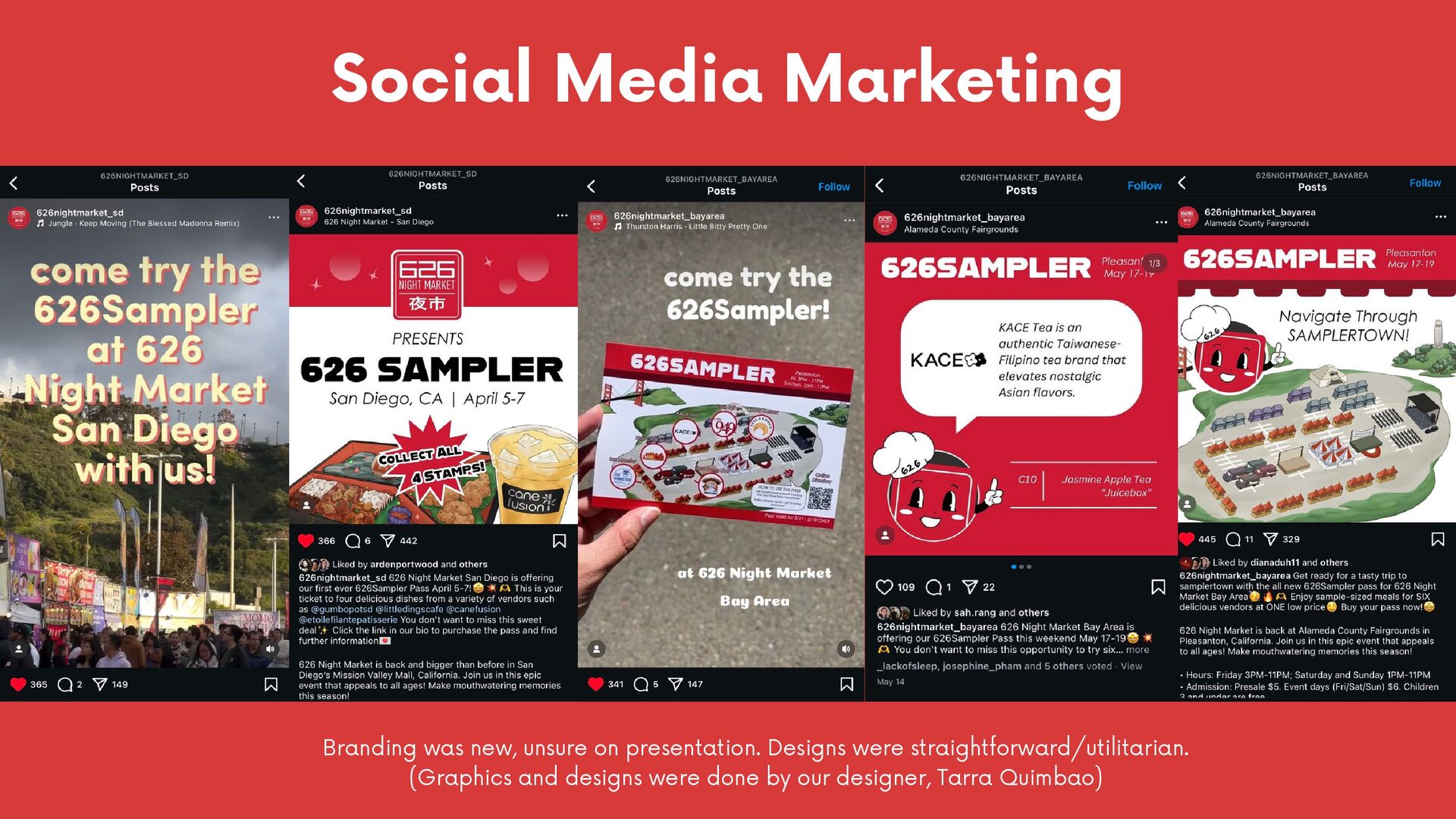deadlines, shallow understanding of market segments. MINUS Have an organizational system compiling all Sampler information into one Google Excel sheet (see next slide), tie in our pre-exisitng sponsors/partners for cross-promotion, create package deals with the sampler and tickets (i.e.: if you have a season pass or buy 2 tickets, you get a discounted sampler). DELTAS PLUS The 626Sampler was my first major project that had a chance to actually make a tangible impact on a company, not just a plan that I wrote for a grade. Seeing it come to life has been one of the most gratifying experiences of my career so far. Receiving support from the people around me from all levels of staff was incredible too. About 4,884 shares About 8,236 likes About 404 comments CUMULATIVE IG SOCIAL MEDIA STATS CUMULATIVE SALES About 2,286 units sold $44,519.2 total revenue, 626 gets $8,865.39. Total profit after fixed costs (no labor): $4,451.