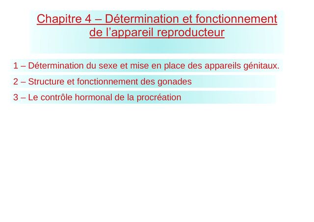 appareils génitaux. Chapitre 4 – Détermination et fonctionnement de l’appareil reproducteur 2 – Structure et fonctionnement des gonades 3 – Le contrôle hormonal de la procréation