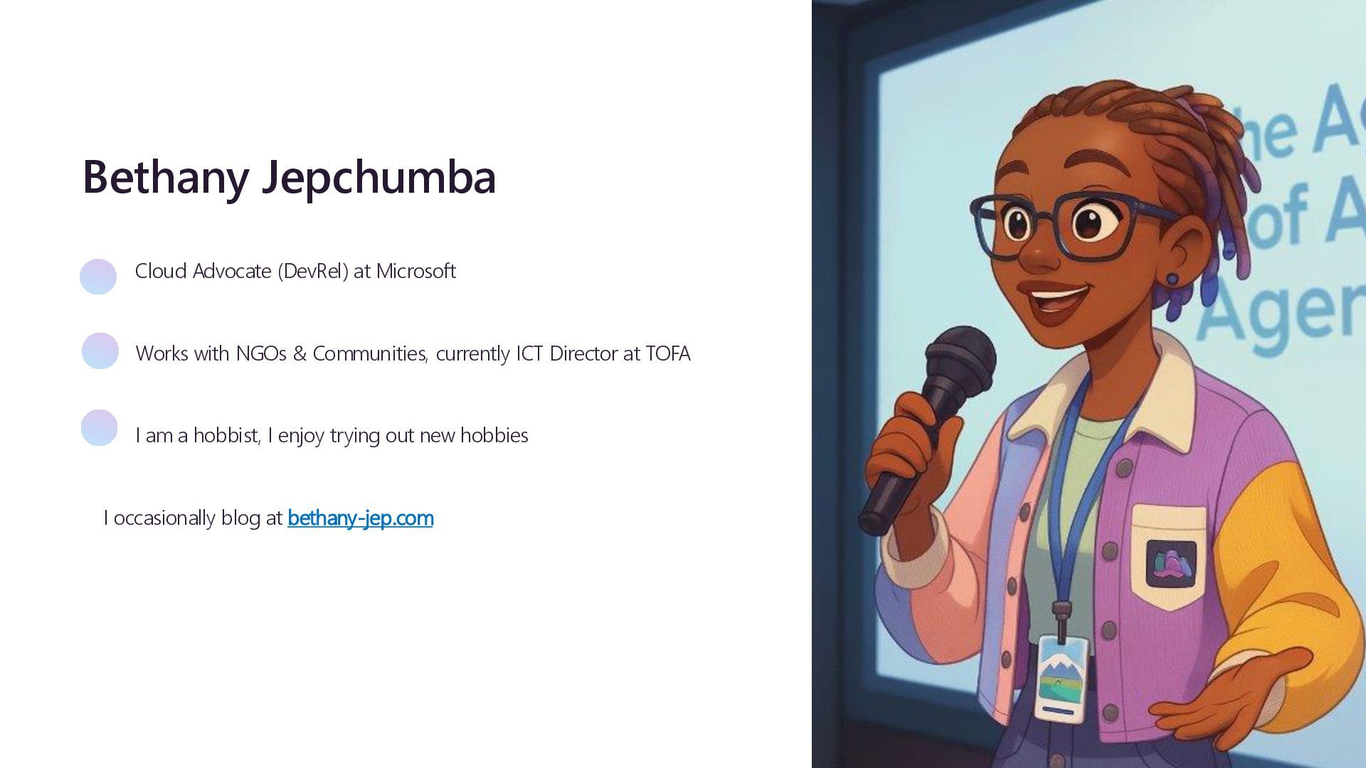 & Communities, currently ICT Director at TOFA • I am a hobbist, I enjoy trying out new hobbies I occasionally blog at bethany-jep.com Bethany Jepchumba Microsoft confidential 2