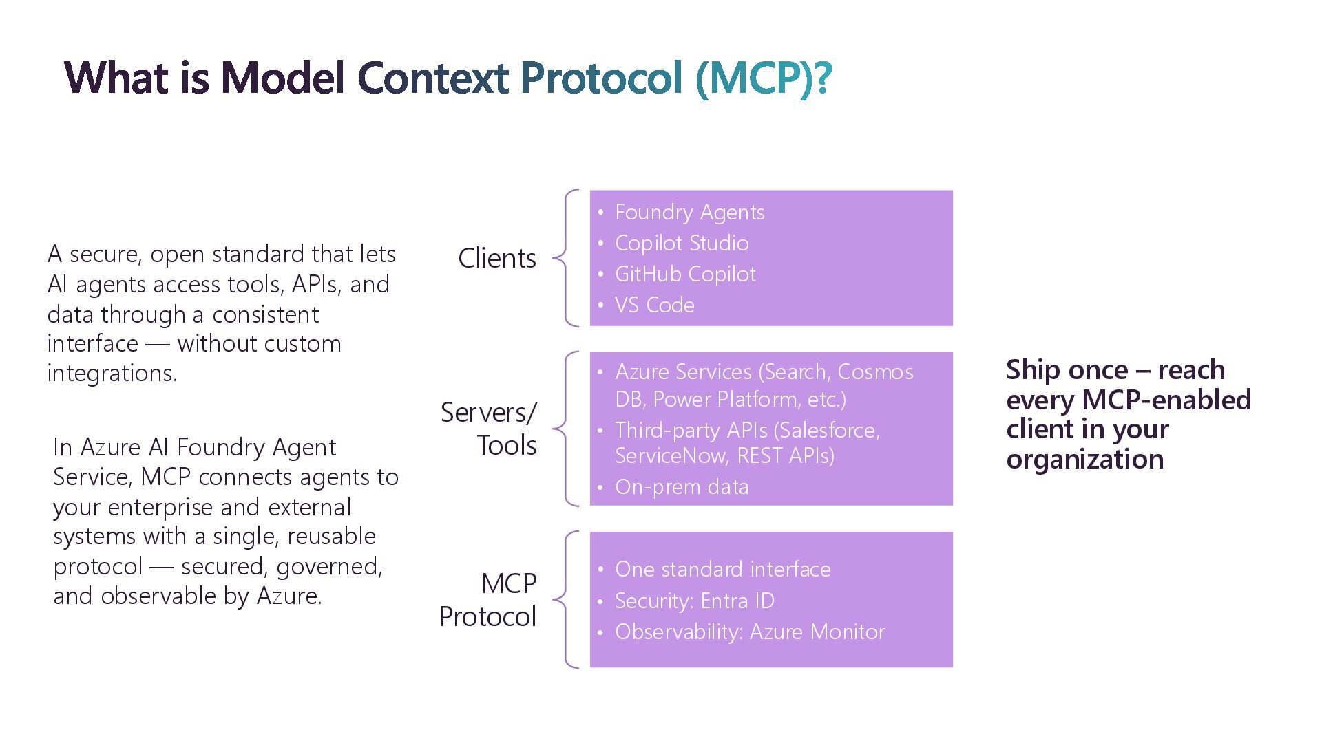 every MCP-enabled client in your organization A secure, open standard that lets AI agents access tools, APIs, and data through a consistent interface — without custom integrations. In Azure AI Foundry Agent Service, MCP connects agents to your enterprise and external systems with a single, reusable protocol — secured, governed, and observable by Azure. Clients • Foundry Agents • Copilot Studio • GitHub Copilot • VS Code Servers/ Tools • Azure Services (Search, Cosmos DB, Power Platform, etc.) • Third-party APIs (Salesforce, ServiceNow, REST APIs) • On-prem data MCP Protocol • One standard interface • Security: Entra ID • Observability: Azure Monitor